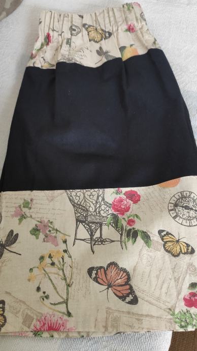Suknja unikat, zanimljivog printa, ručno šivana, visoki rastezljivi struk, 53 cm dužina, 38 cm opseg struka, nova.