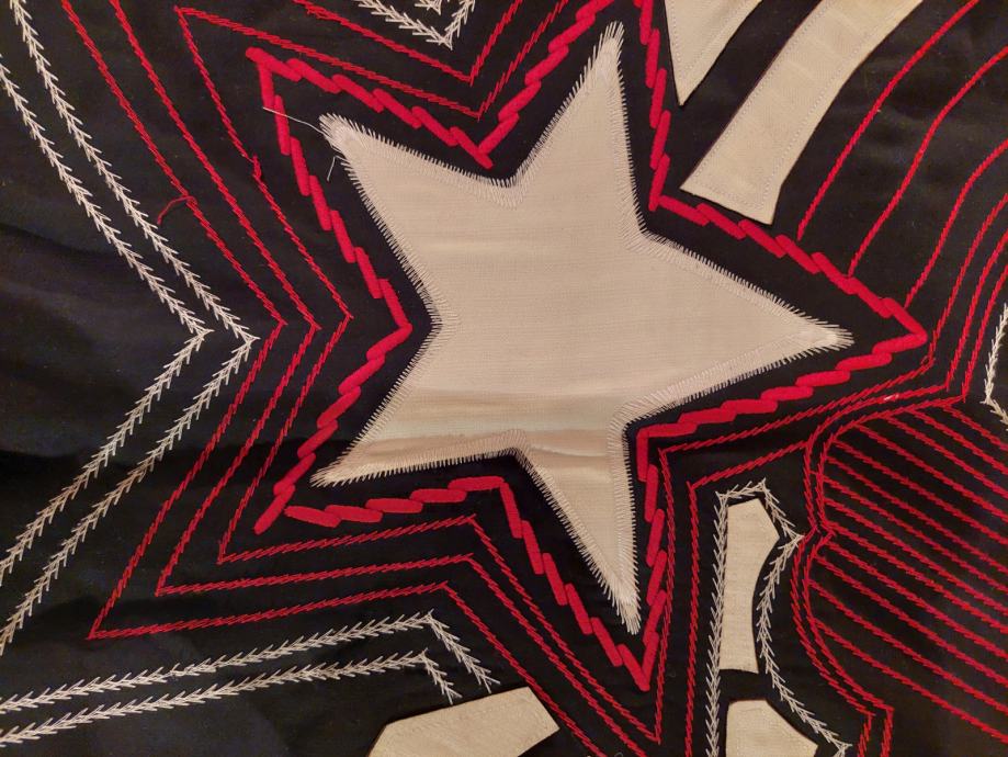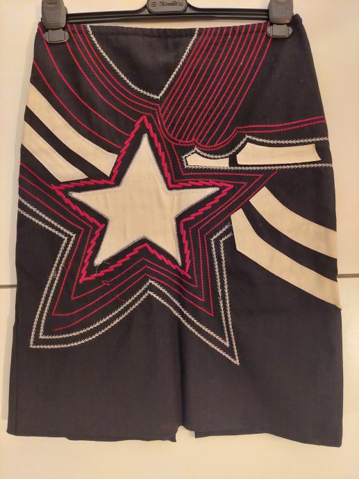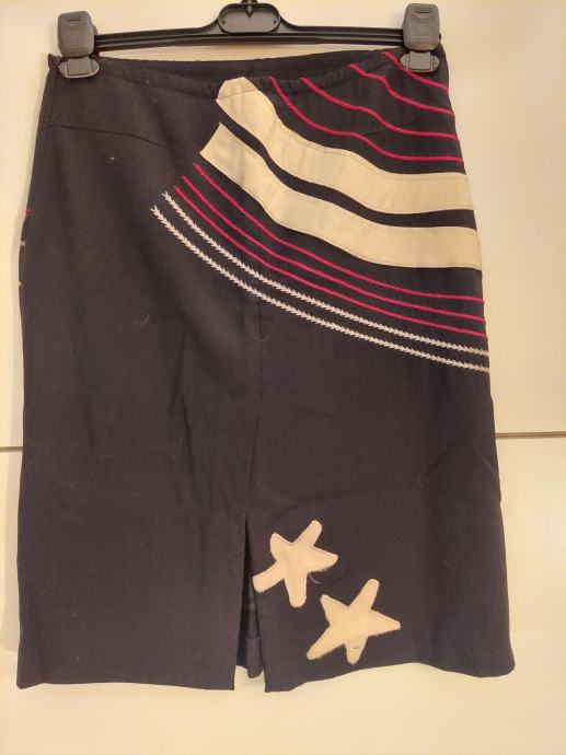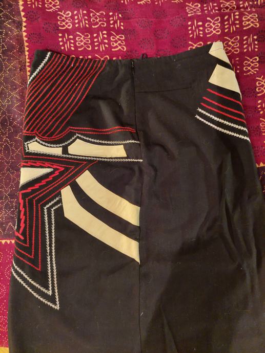 Posebna suknja s puno veza, od velike zvijezde s prednje strane do ušitaka uskih i širokih u raznim bojama. Osnova je crna, a dodana je crvena, bijela, komadići našiveni obrubi podebljani. Sve šaroliko i veoma zanimljivo, da ne kažem lijepo. Spada u seriju E.Play veličina je S, ali i M užih kukova vjerojatno ju može obući. Malo je ispod koljena ili do koljena, ovisi o vašoj visini. Definitivno jedinstven uzorak suknje, mislim da i je jedina.