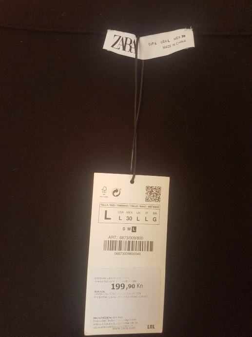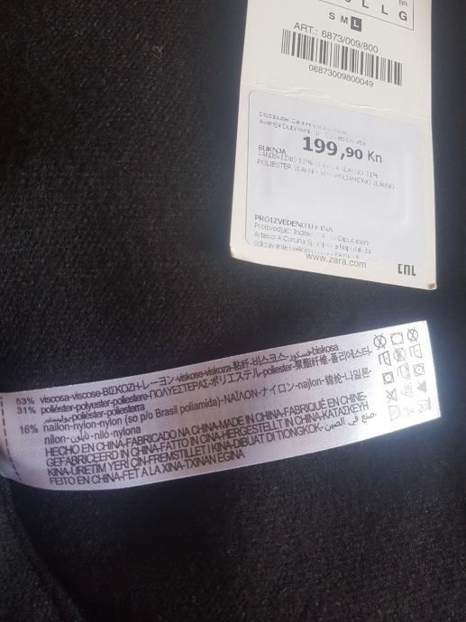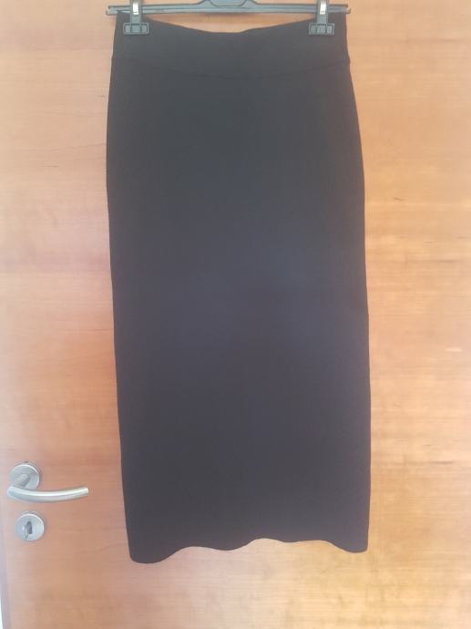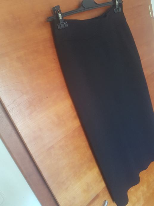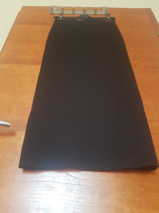 Duga crna suknja, tuba kroj, rastezljiva, bez kopčanja. Sastav: 53% viskoza, 31% poliester, 16% najlon. Deklarirana kao broj L, po meni M. Kupljena u Zara / Zagreb. Novo, etiketa. Izvorna cijena: 199,90 kn, prodajem za 150 kn.