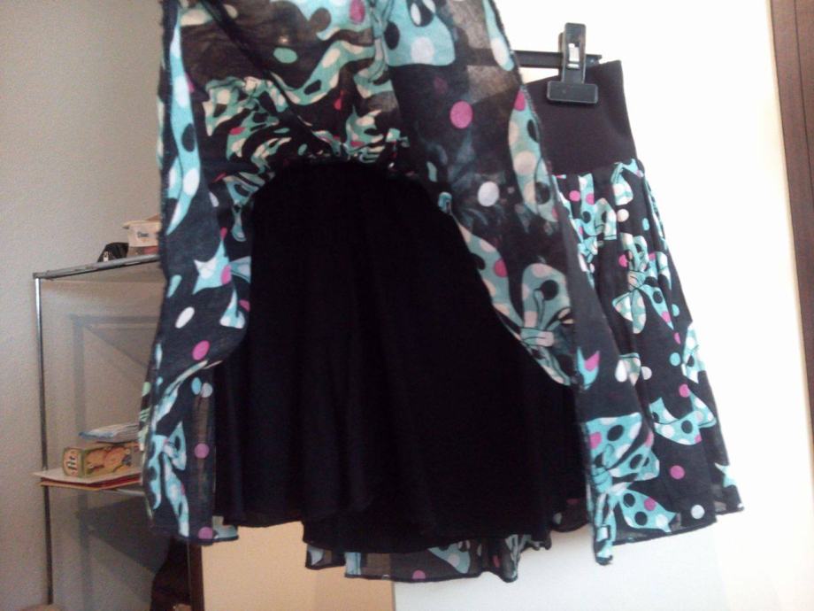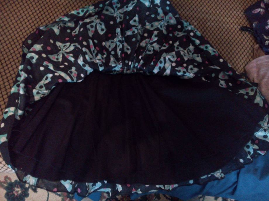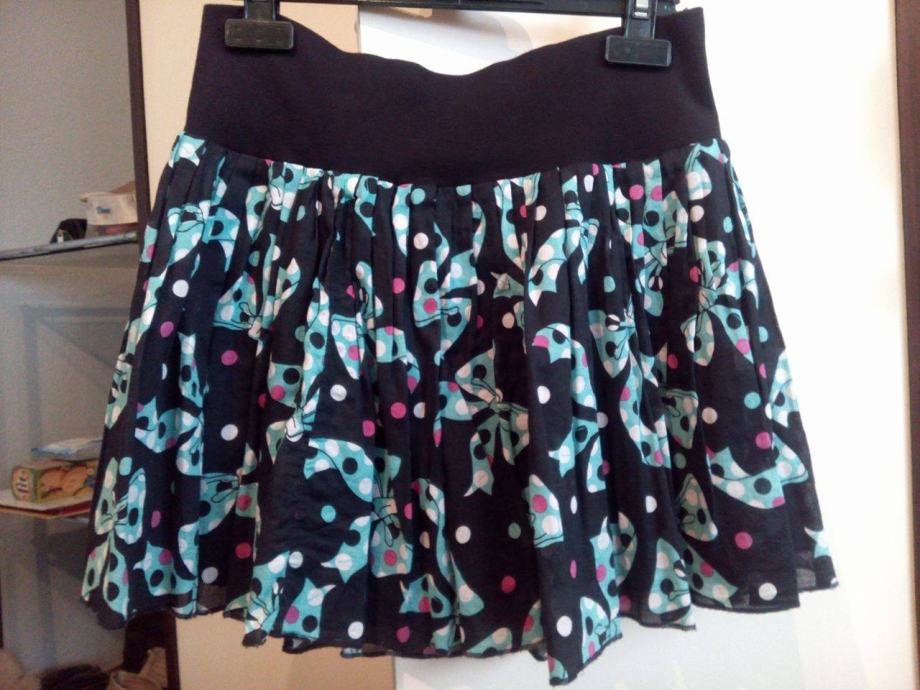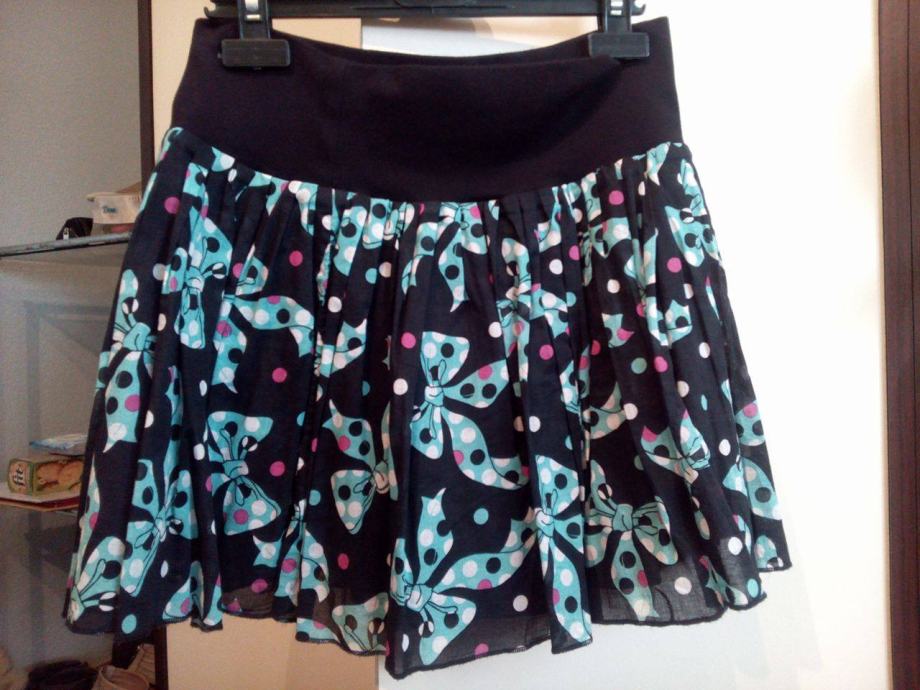 Suknjica na mašne, veličina 36, marke H&M, puni krug, odlično pada, ima postavu, pamučna, nosena 2-3 puta, kao nova. Gore na struku je rastezljva, formira se po struku. Boje-crna, tirkizna, bijela, roza