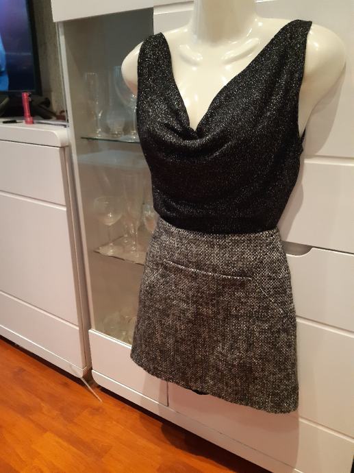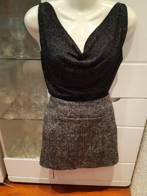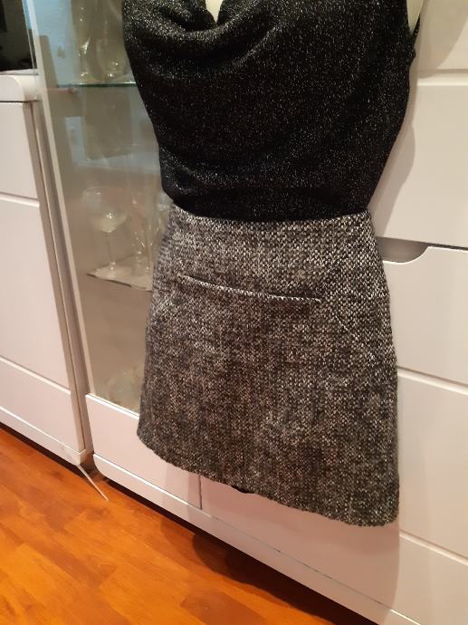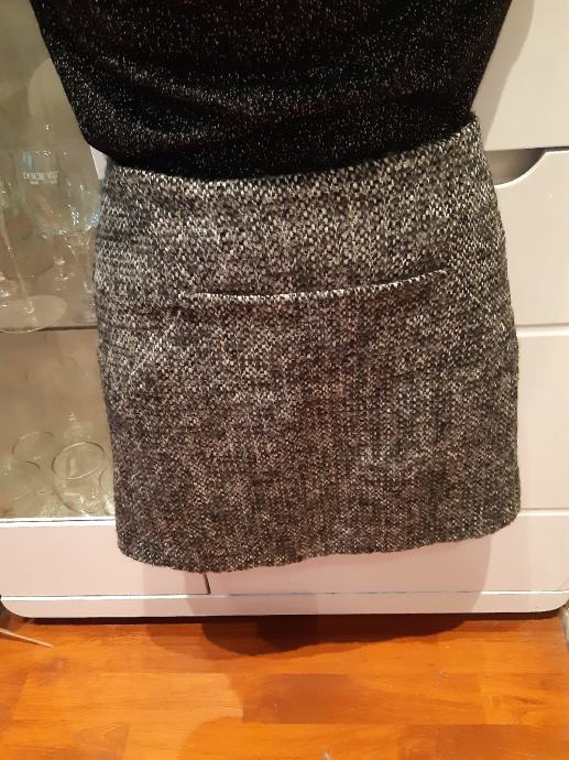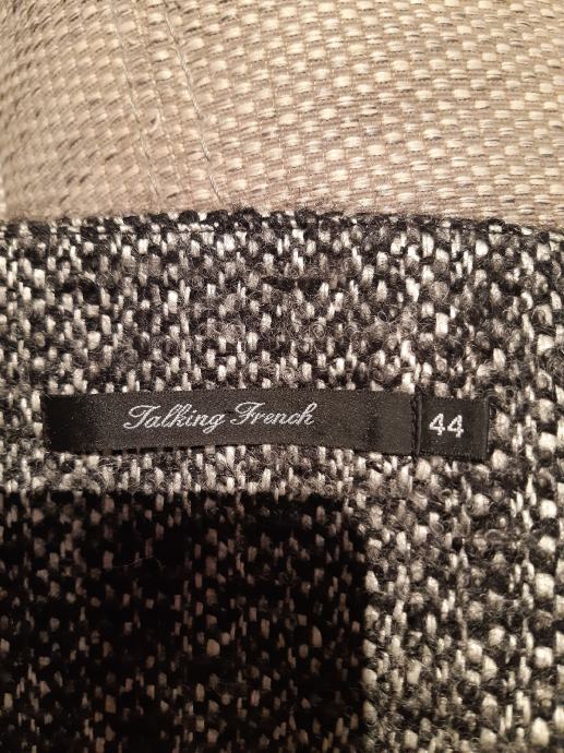 TALKING FRENCH siva podstavljena suknja od buklea, vel. 44. Sirina struka, samo prednja strana: 46 cm, bokova: 52 cm, duzina suknje: 39 cm. Sastav: scherwool: 50%, alpaca: 11%, moher: 11%, poliamid: 8%.