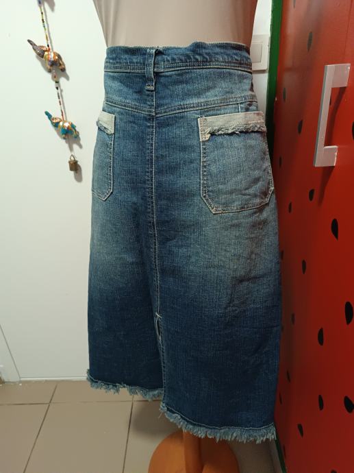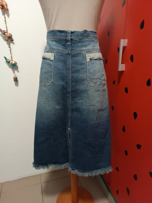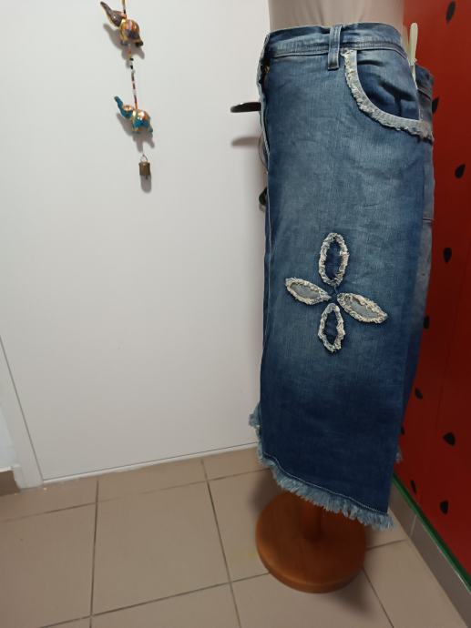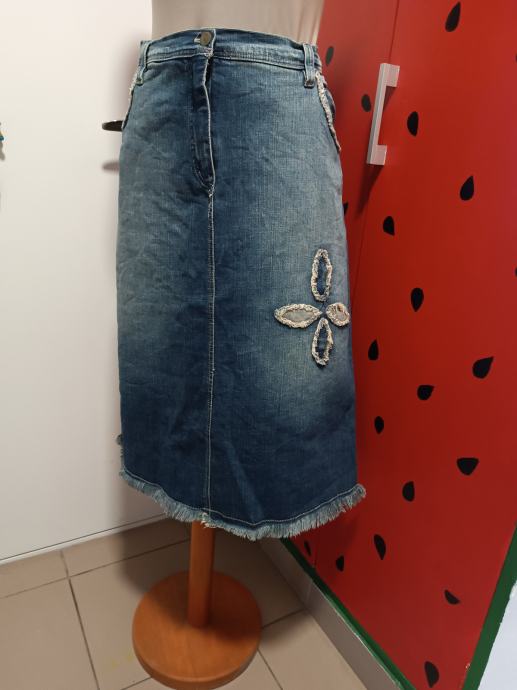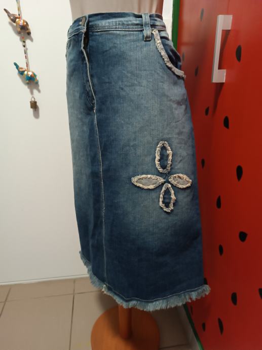 Preslatka traper suknja A-kroja s resicama na porubu i džepovima. Ukrasna izvezena aplikacija u obliku cvijeta. Iza ima otvor.