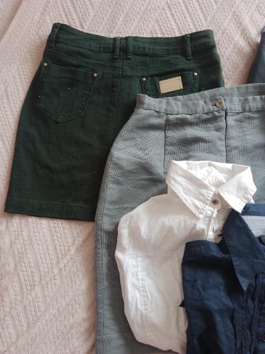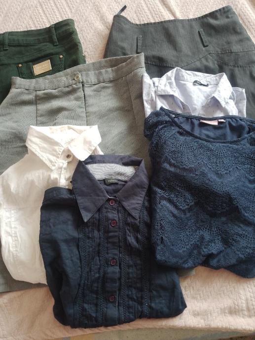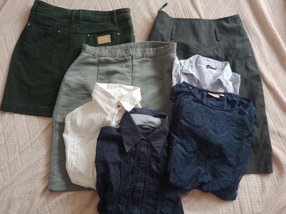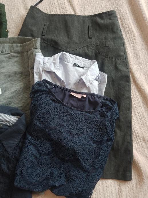 Veliki poslovni lot odjeće za ljeto i jesen sastoji se od 3 suknje , 3 košulje i jedne svečanije majice s čipkom (rukavi su prozirni, ostalo nije) . Sve je veličina S / 36 . Sve kao novo , bez tragova niošenja. Maslinastozelena traper kratka suknja, mekana kraća suknja od tankog trapera pencil kroj i tamnosiva midi suknja pencil kroj, Dvije košulje bijela i modra dugi rukav, orsay košulja kratki rukav i svečana bluza / majica . Sve košulje su strukirane i odgovaraju čistom broju 36 . Cijena za lot: 10 eura + pt.