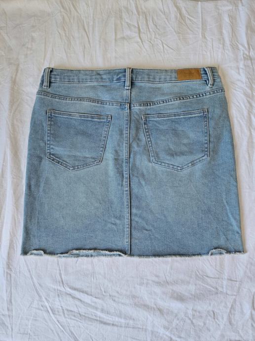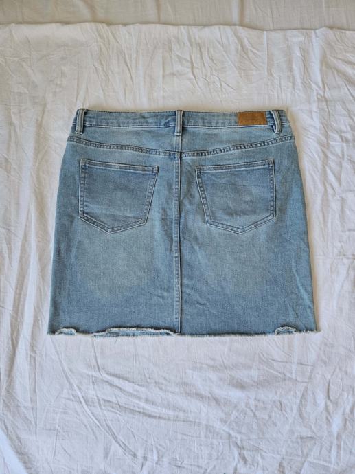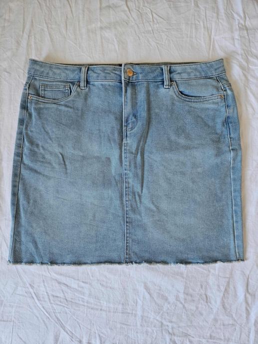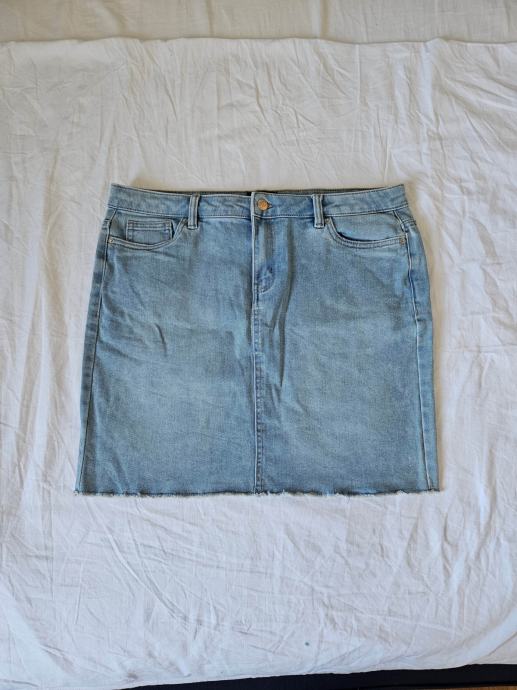 Nova i nikada nošena, samo oprana jeans svijetloplava mini suknja marke Vero moda. Uska, strukirana, dužine iznad koljena. Veličina XL, dimenzije: širina u struku: 44 cm, u bokovima: 50 cm (zbog elastičnosti širi se za još 1 - 2 cm), dužina: 45 cm.