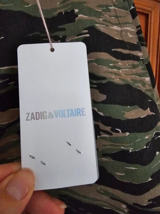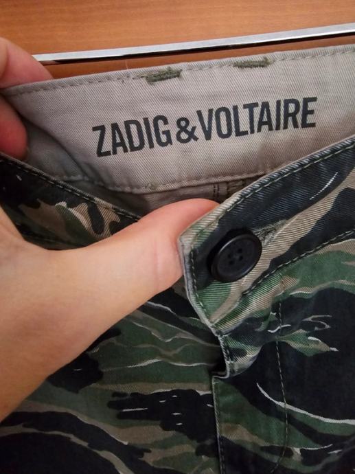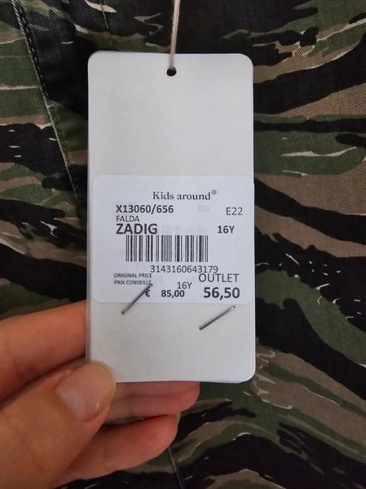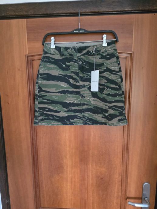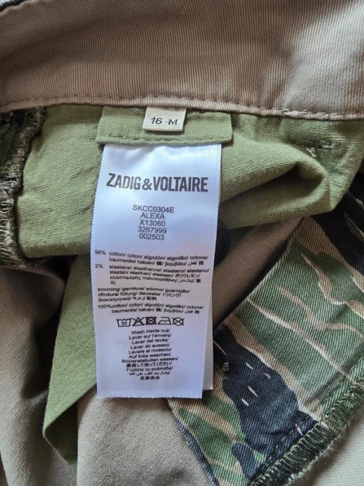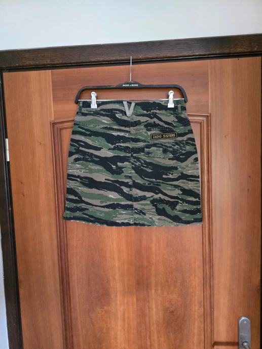 Suknja je dječja, ali kako na njuškalu postoje djeca samo do 13 godina, nemam ovo gdje smjestit u dječiju kategoriju pa moram u ovu za odrasle. Nova dizajnerska Zadig & Voltaire military traper suknja veličina 16 godina(odgovara i odrasloj XS veličini). Sastrane ima džepove, sa etiketama pa je odlična i za poklon. Kupljena u outletu i plaćena gotovo 60 eura na sniženju. Struk 35cm, bokovi 45cm, dužina 42cm. 98% pamuk 2% elastin.