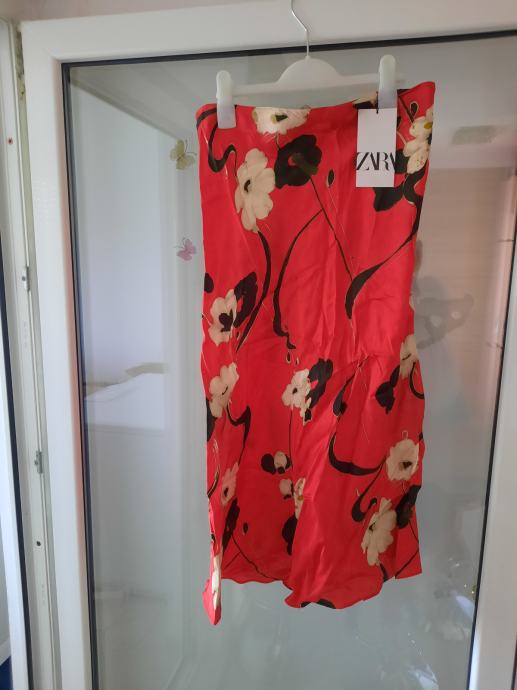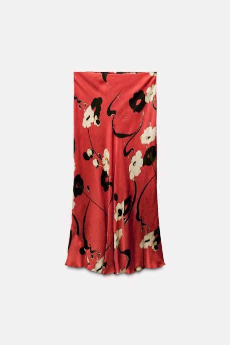 Midi suknja srednje visokog struka izrađena od 100% viskoze. Kontrastni cvjetni uzorak. Lepršavi donji rub.