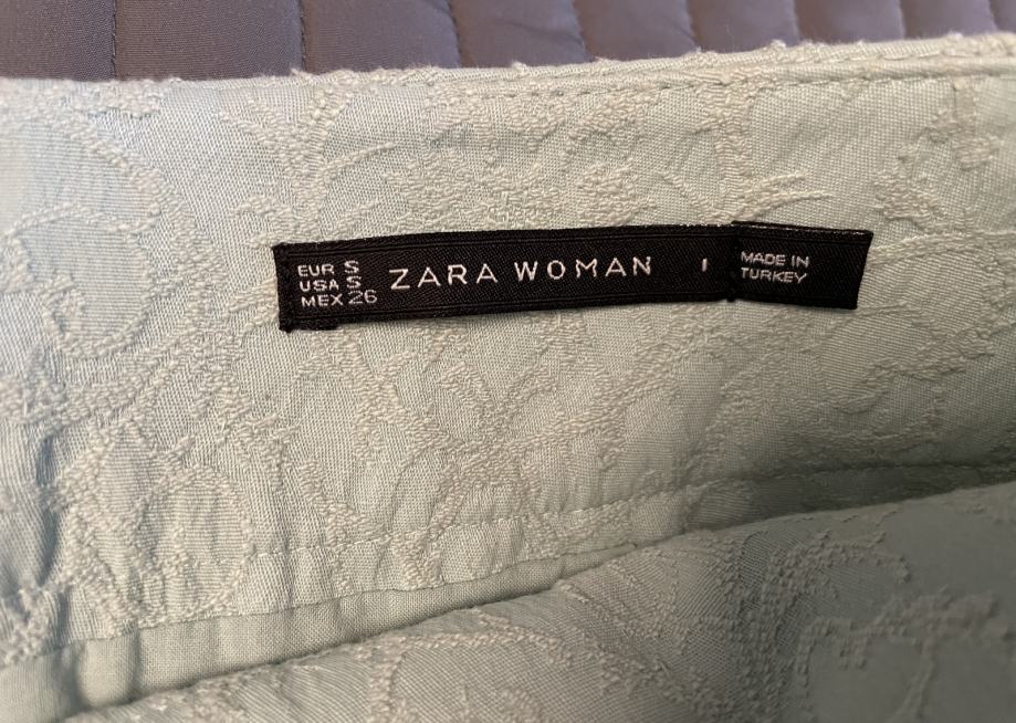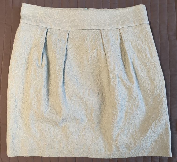 Prodajem Zara brokatnu suknju, mint boje, u veličini S. Suknja je nova, nikad obučena, samo su skinute etikete. Širina struka je 74cm, duljina 44cm. Suknja ima i džepove.