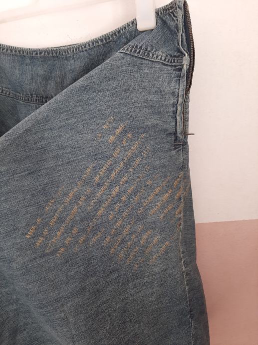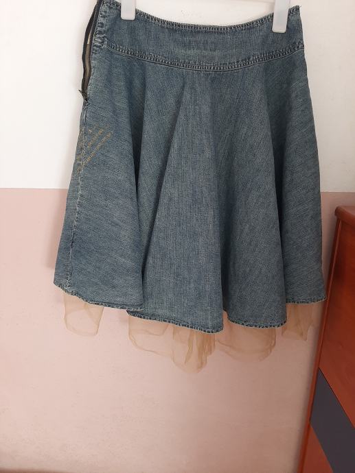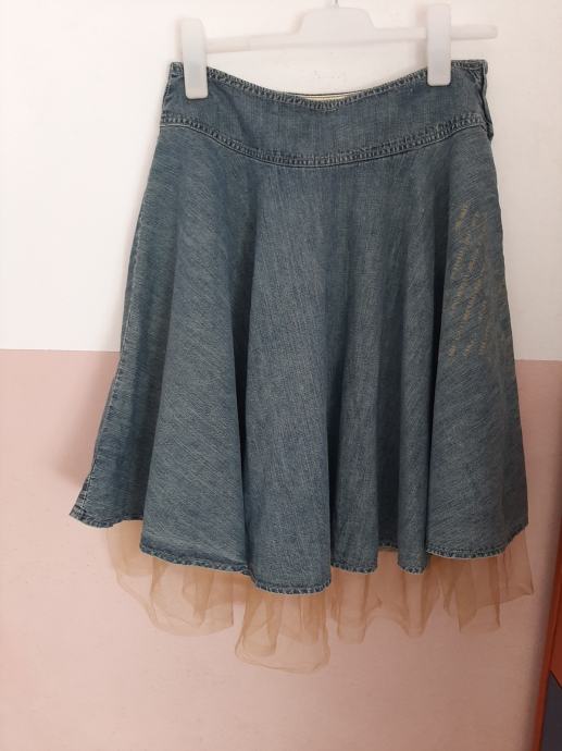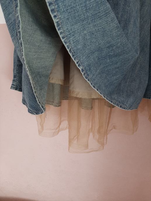 Prekrasna ženska traper suknja u kombinaciji s tilom na kraju. Vrlo lijepo stoji. Nošena ali očuvana. Vel. 38-40. Dužina od vrha pasice do dolje 60cm+10cm til. Širina u struku 40cm