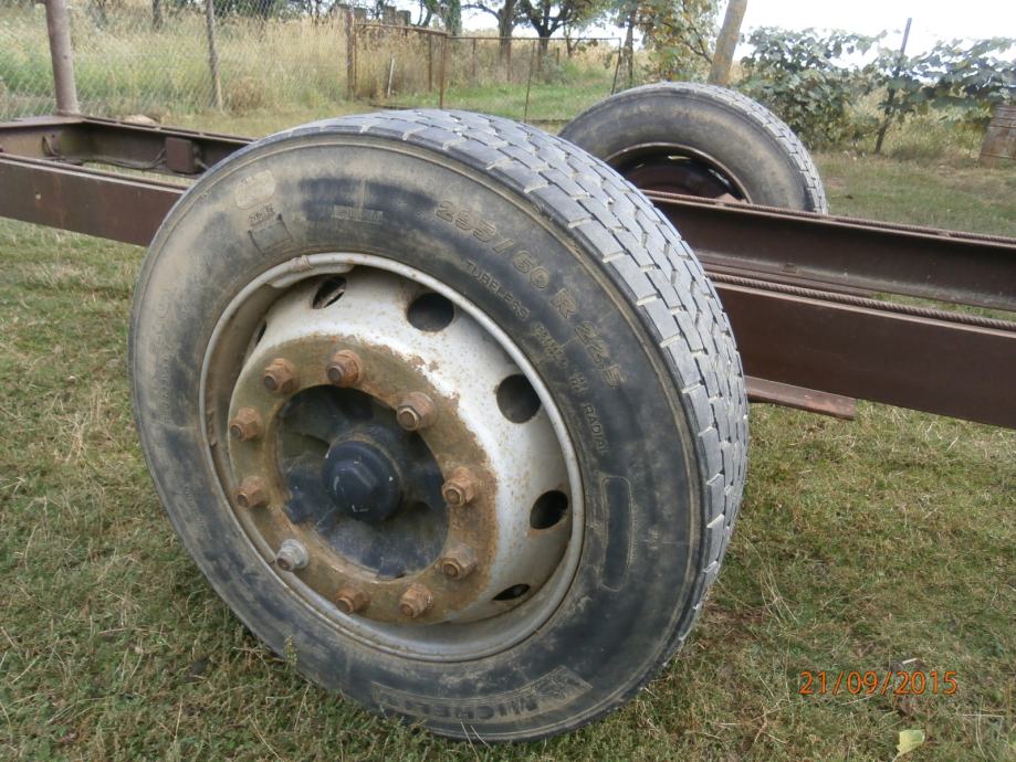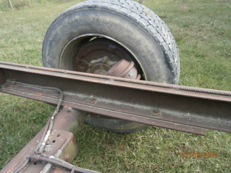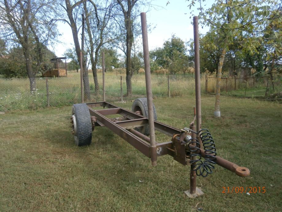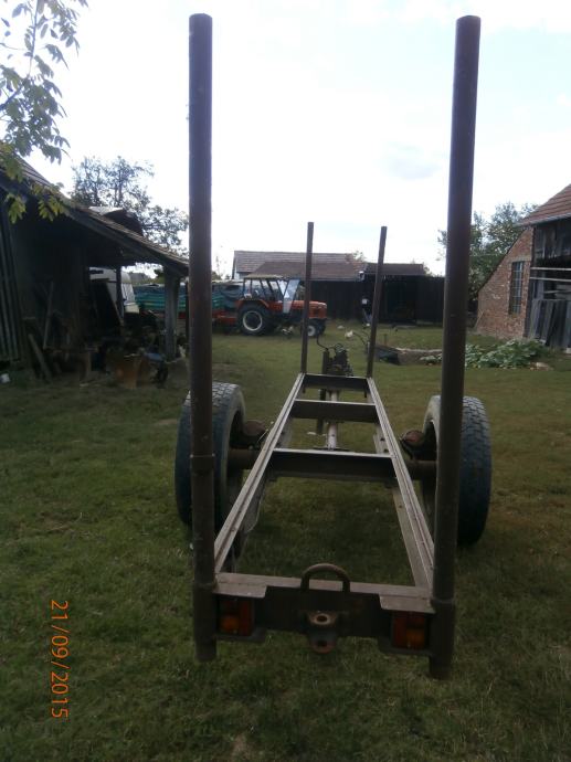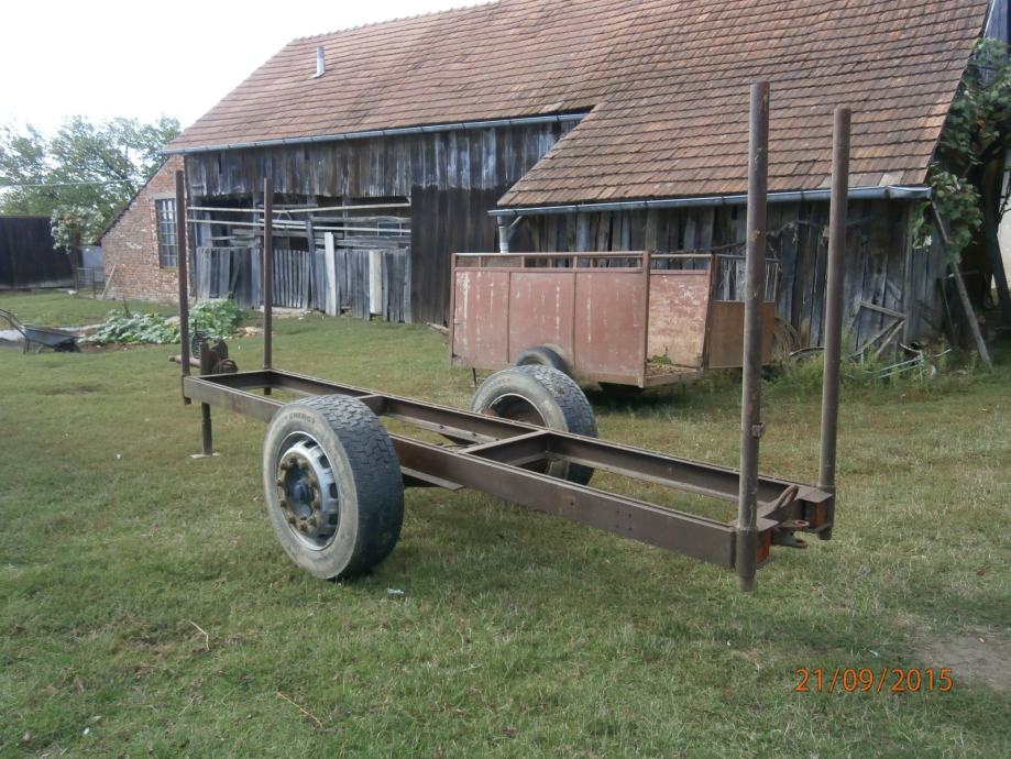 prodajem prikolicu za drva sa zračnim kočnicama jake konstrukcije od U profila dužina 4,5 M visina štica 1,5 M osovina od kamiona gume 295 60 R22,5 osovina se može pomaknut prema natrag na vijcima između osovine i šasije.
