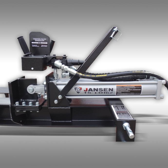 Horizontalni cjepač Jansen TS-14L62 sa traktorskim pogonom. Cjepač se pokreće hidraulikom traktora. Dakle uvjet za priključak je vlastita hidraulika traktora ili priključci za dovod i povrat hidraulike. Cjepač je montiran na standardnu polugu u tri točke, što vam omogućuje podešavanje visine cjepača ili radne visine. Uz jednostruku sjekiru uključena je i križna sjekira. Snaga cijepanja je 14 tona, a najveća duljina cijepanja je 62 cm.