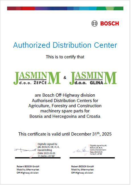 Jasmin M d.o.o. je ovlašteni zastupnik Bosch Off-road programa sustava ubrizgavanja, električne opreme i ostalih komponenti koje koriste svi svjetski proizvođači vozila i strojeva.