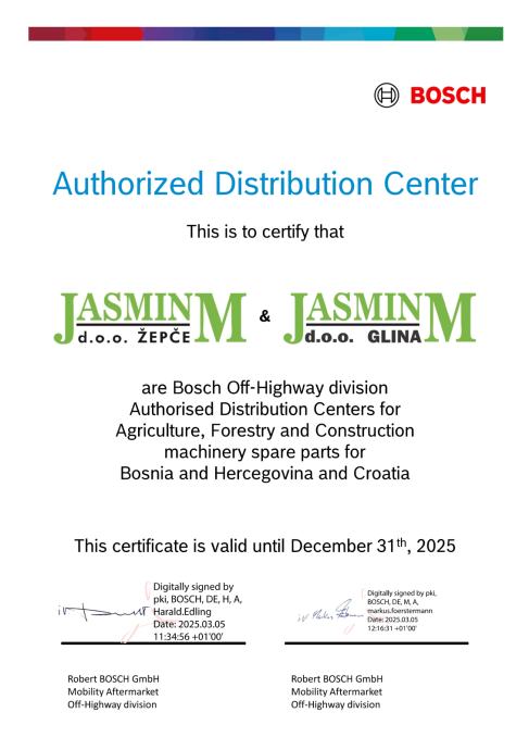 Jasmin M d.o.o. je ovlašteni zastupnik Bosch Off-road programa sustava ubrizgavanja, električne opreme i ostalih komponenti koje koriste svi svjetski proizvođači vozila i strojeva.