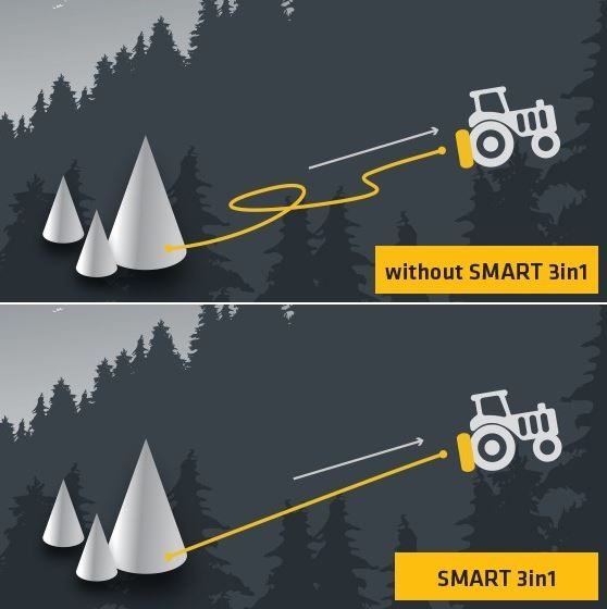 (1) Prilikom povlačenja trupaca tijekom vožnje, traktor može naići na određenu prepreku (uzdignuće, korijenje). Ako traktor ne može nadvladati ove prepreke, funkcija pražnjenja se prebacuje u način bez potpore napajanja kako bismo mogli nastaviti vožnju s napetom žičanom užad između vitla i opterećenja. (2) Uključivanje i isključivanje bubnja odvijat će se bez odgađanja (za klasičnu verziju, kašnjenje je 1.5 sekundi). (3) SMART 3in1 također pruža napon žičane užadi između remenice za odmotavanje i bubnja.