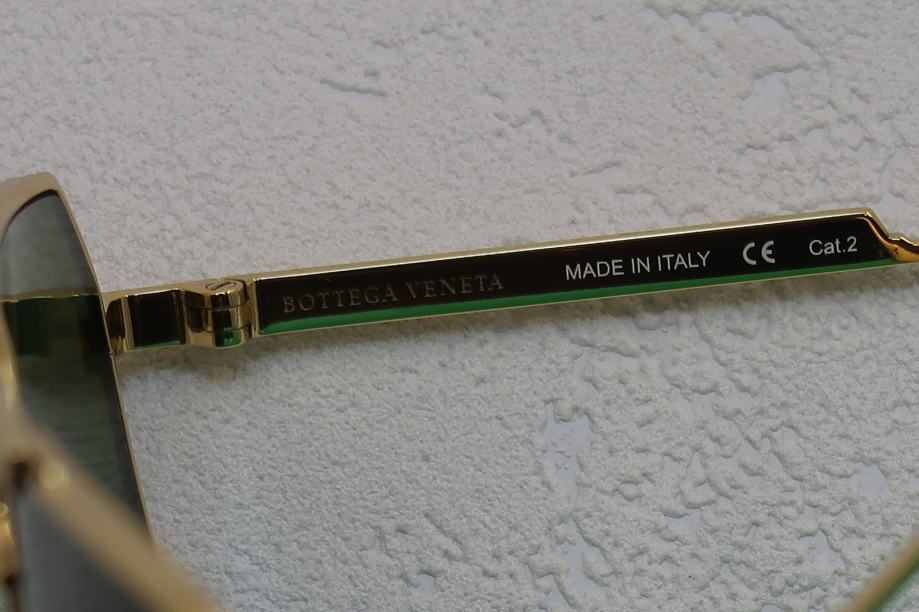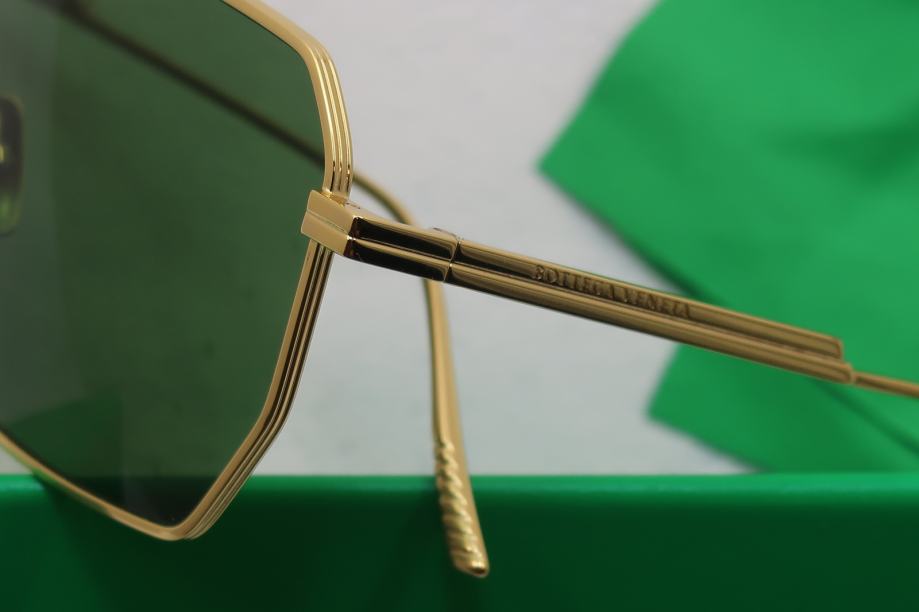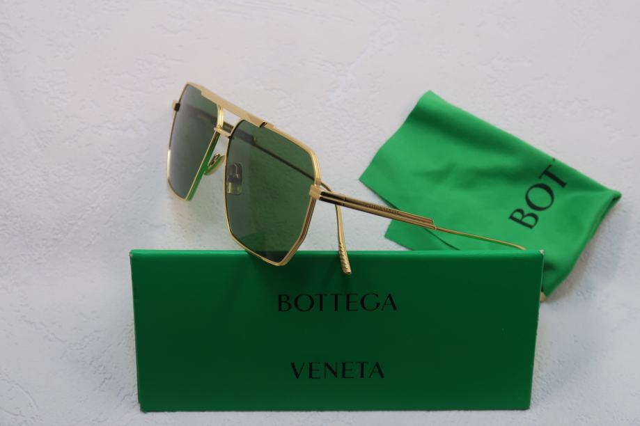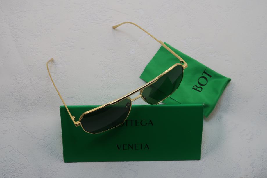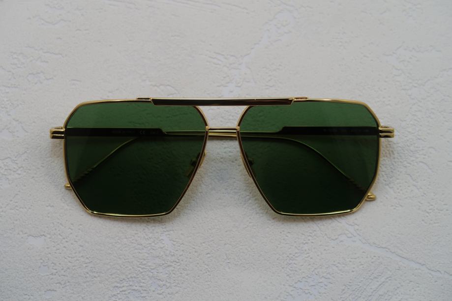 Prodajem originalne Bottega Veneta BV1012S sunčane naočale — luksuzni metalni pilot okvir, zlatna boja, zelene leće (Cat. 2, UV 400), dimenzije 60 ☐ 13–145. Made in Italy, u kompletu s originalnom kutijom i krpicom.