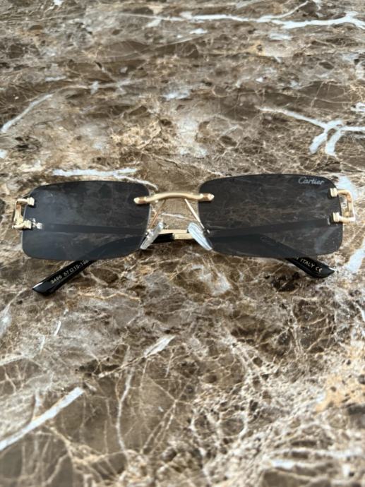 Prodajem Cartier muške sunčane naočale, nove s etiketom. Radi se o modelu bez okvira s tamnim sivim staklima pravokutnog oblika i zlatnim metalnim detaljima na stranicama i mostiću. Dizajn je minimalističan i prepoznatljiv, karakterističan za Cartier. Dolaze u originalnoj crvenoj kutiji.