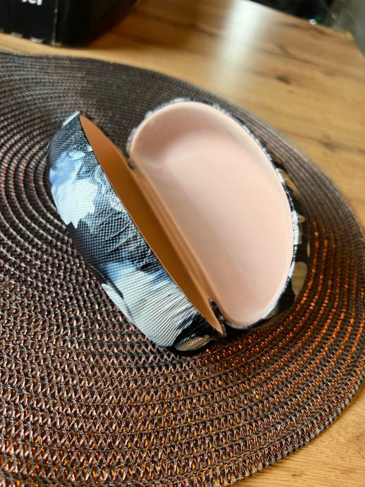 Prodajem etui za naočale, novo bez etikete. Čvrsta tvrda futrola s cvjetnim uzorkom u sivim i crnim tonovima, s mekanom ružičastom unutrašnjošću koja štiti naočale od ogrebotina. Dimenzije su otprilike 13 cm u duljinu, što odgovara većini standardnih okvira naočala.