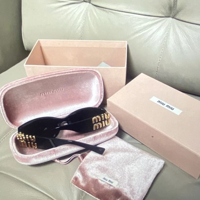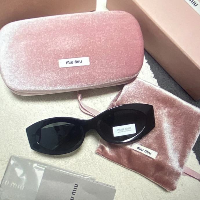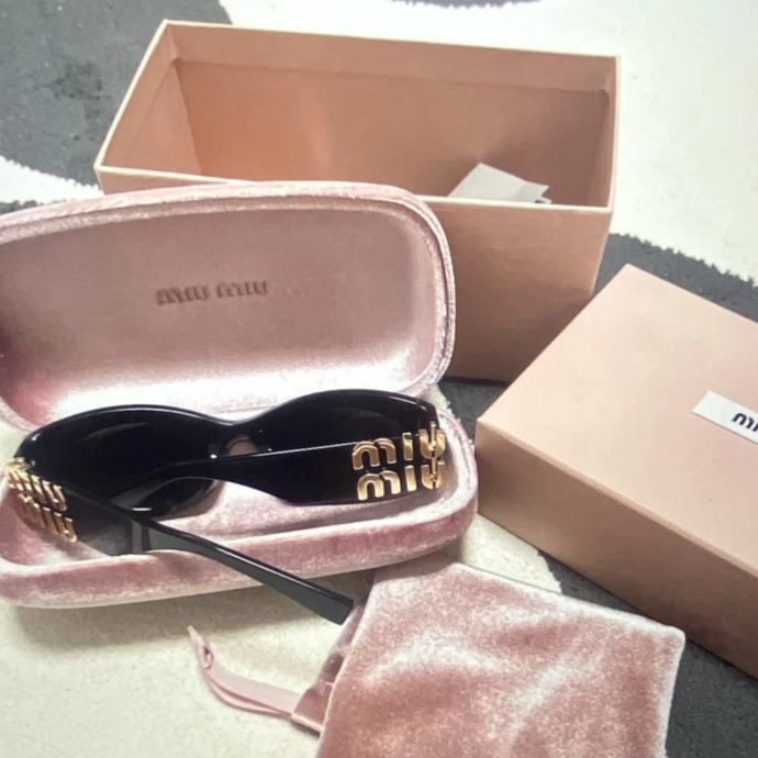 Prodajem Miu Miu Cat Eye sunčane naočale, nove s etiketom. Okvir je crne boje s prepoznatljivim zlatnim Miu Miu logotipom na stranicama. Dolaze s originalnom ružičastom baršunastom futrolom, vrećicom za čišćenje i originalnom kutijom.