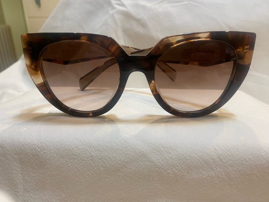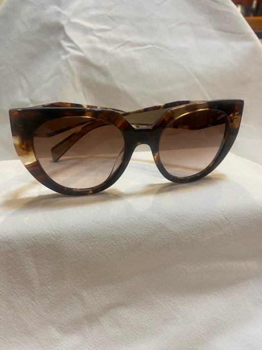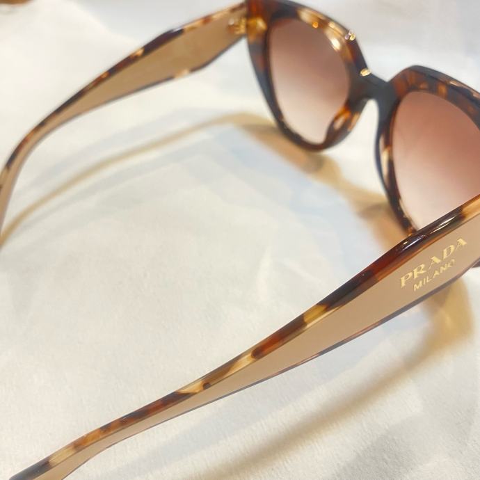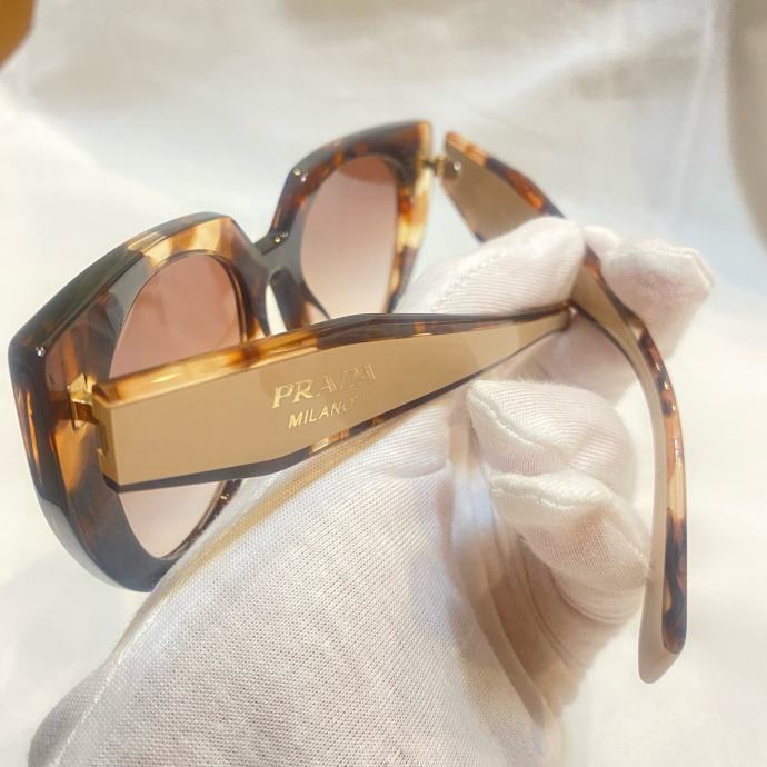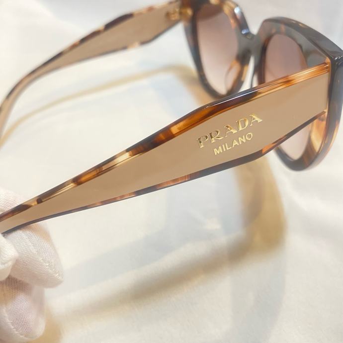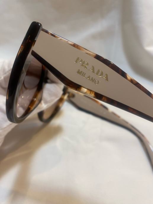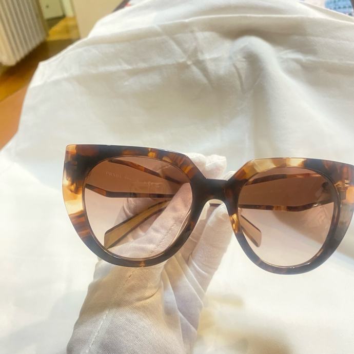 Prodajem originalne Prada sunčane naočale, nove bez etikete. 14WS. Radi se o njihovom poznatom oversized modelu s okvirima u tortoise uzorku, kombiniranim s gold detaljima na stranicama na kojima piše "Prada Milano". Stakla su roze-smeđe nijanse s gradijent efektom. Okvir je izrađen od acetata i daje naočalama voluminozan, izražajan izgled.