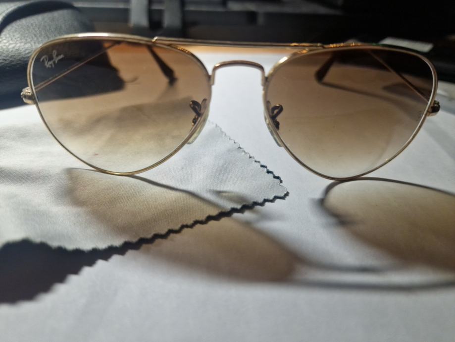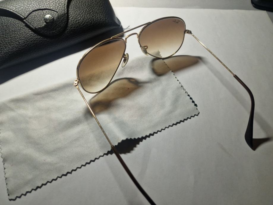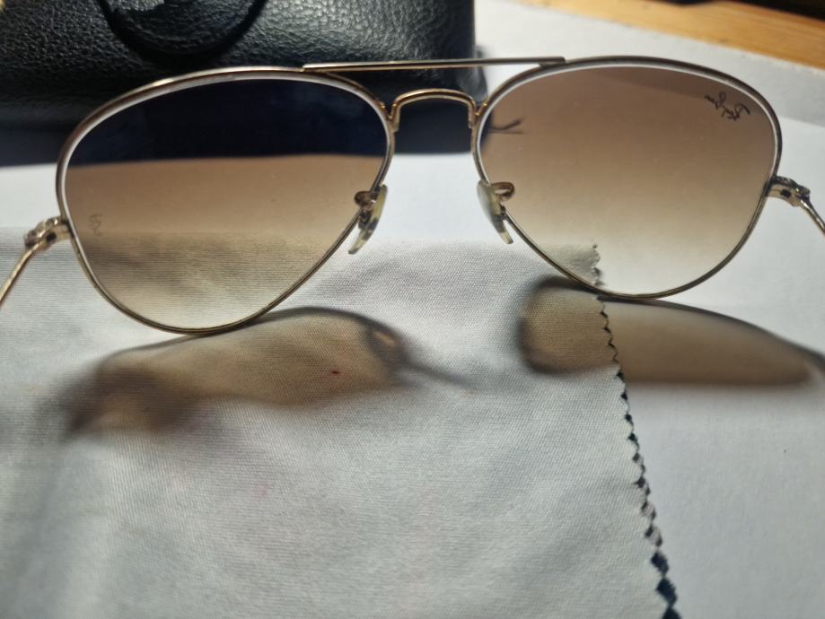 Prodajem sunčane naočale Ray-Ban Aviator Gradient, zlatne sa smeđim/bež prijelazom. Naočale su nošene jedanput, nema oštećenja, oštećenja vidljiva na futroli, cijena se da smanjiti zbog toga. Prodajem jer su višak. Dolaze uz krpicu i futrolu. Veličina: 54