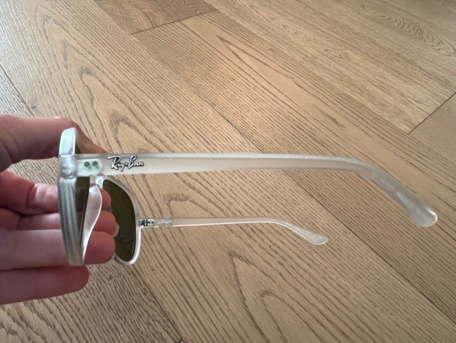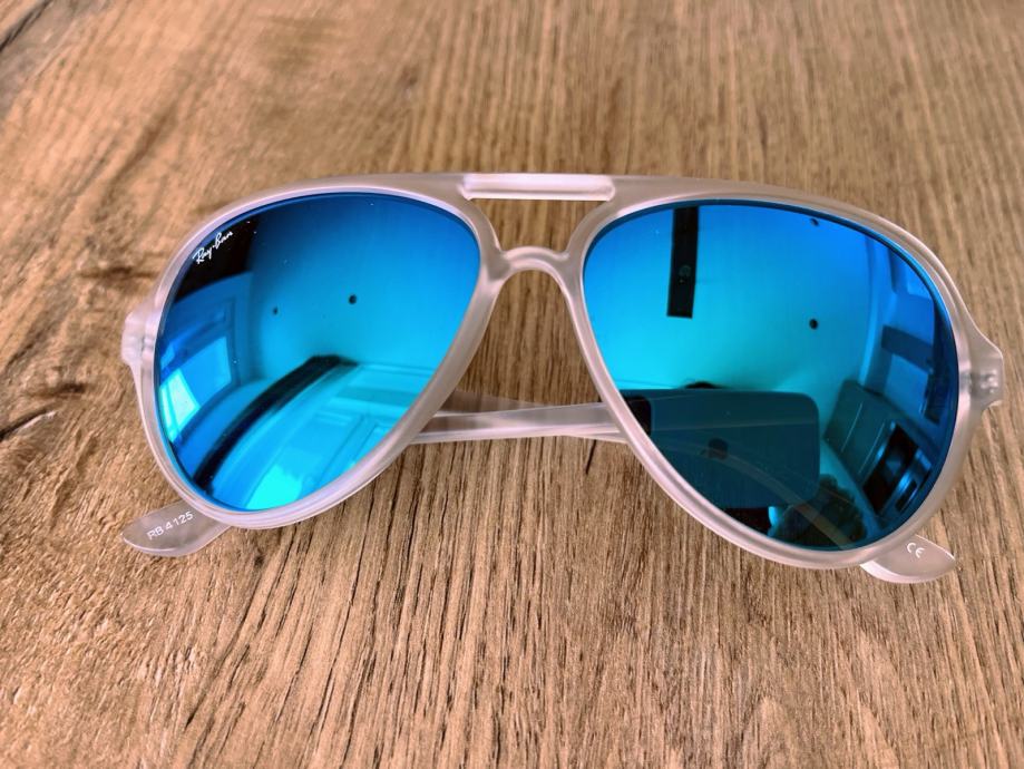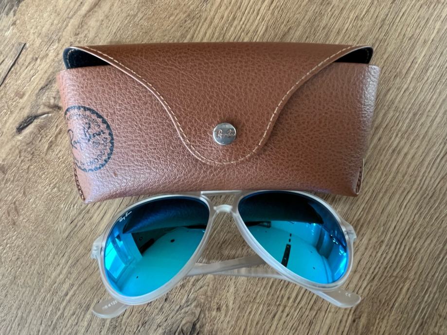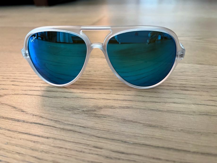 Ray-Ban sunglasses, mirrored blue lenses, white transparent frame. No scratches or damages. Excellent quality and condition! Original box included.