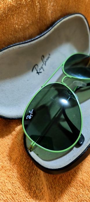 Ove unisex Ray-Ban sunčane naočale su Aviator Full Color Legend model. Karakterizira ih pilotski oblik i upečatljiva neonsko zelena boja okvira i drški, s tamnim lećama. Ovaj model je izrađen s metalnim okvirom i polariziranim staklenim lećama koje pružaju potpunu UV zaštitu. Nošene svega tri puta.