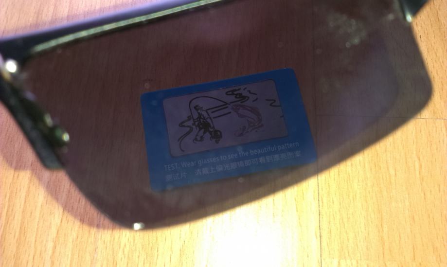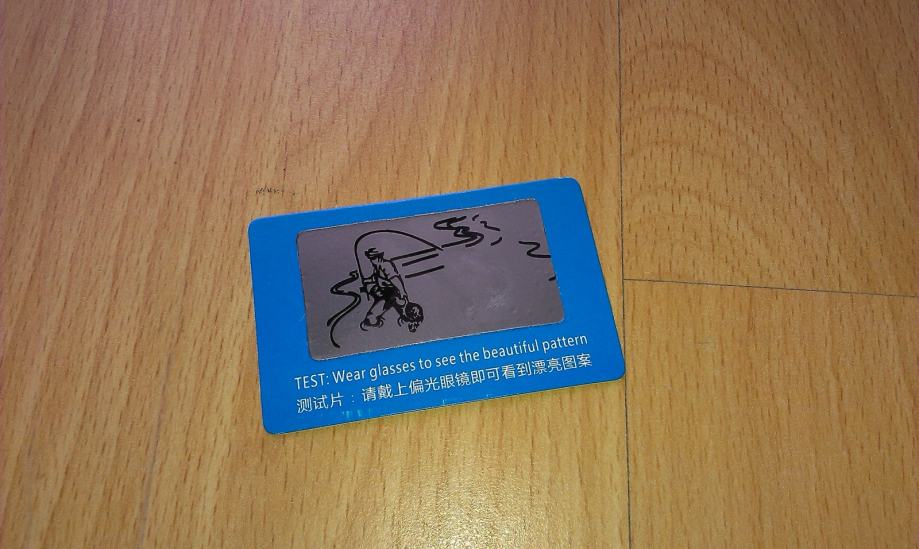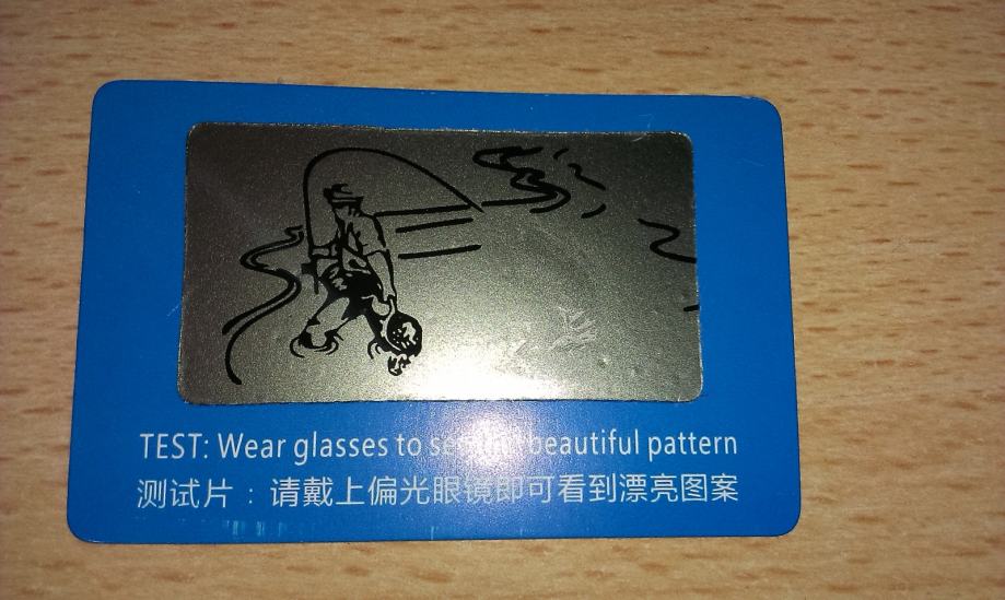 - Tester kartica za provjeru polariziranih stakala sunčanih naočala. Želite li biti sigurni da su leće naočala koje kupujete stvarno polarizirane, ovo je prava stvar! Naročito ako ih kupujete na placu ili sumnjate zbog niske cijene ili nekog drugog razloga. Malih dimenzija (6 cm x 4 cm) pa stane u svaki pa i najmanji novčanik. --- 1.5€