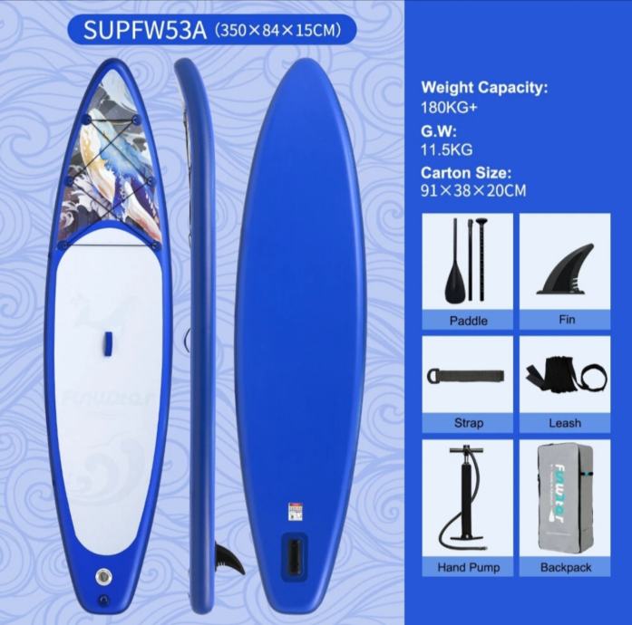 U paketu dolazi središnja peraja (fin) za bolju stabilnost smjera te aluminijsko veslo iz tri dijela koje se može prilagoditi željenoj visini. Površina za stajanje presvučena je protukliznom EVA podlogom za dodatnu sigurnost, a neoprenska ručka olakšava nošenje. Integrirani D-prstenovi omogućuju postavljanje elastične trake za sigurno pričvršćivanje osobnih stvari ili prtljage.