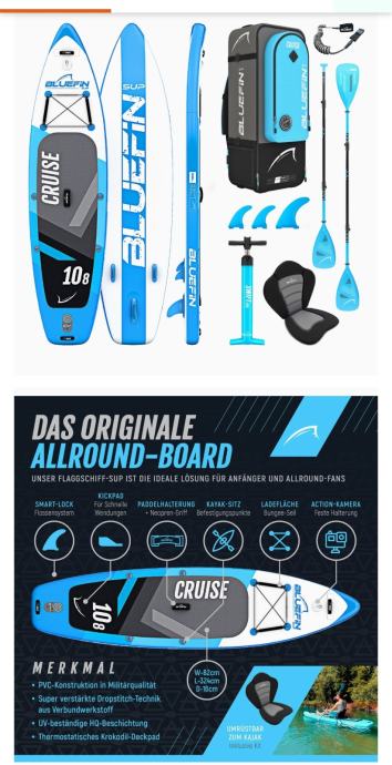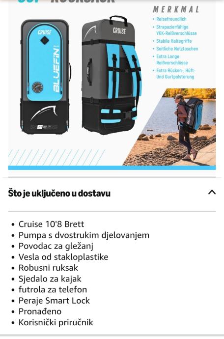Bluefin Cruise SUP set je napuhujući all-round paddleboard paket, dizajniran za stabilnost i svestranost. Model u boji „Cruise plava“ ima duljinu od 10'8'' (otprilike 325 cm) i namijenjen je odraslim osobama.
