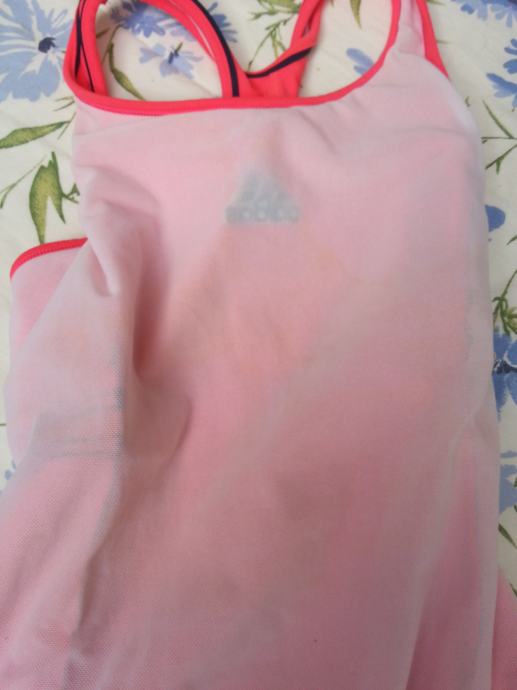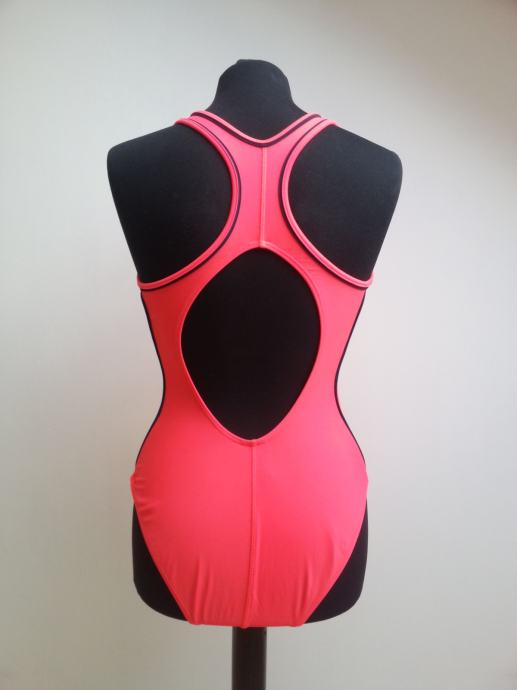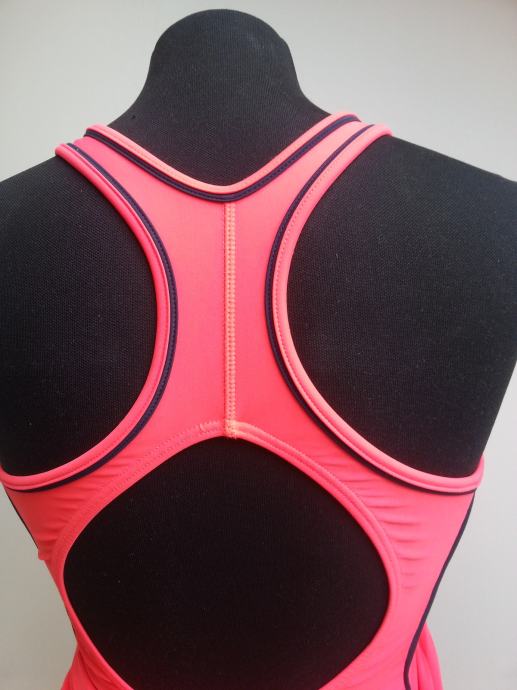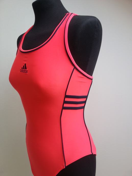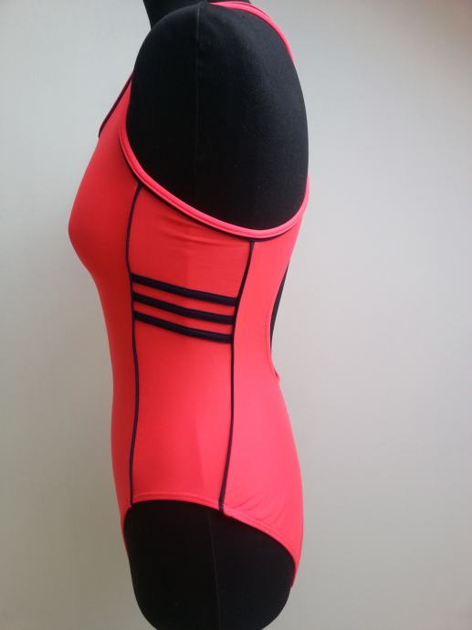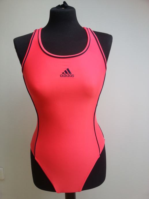 ADIDAS jednodijelni kupaći kostim, neon narančaste boje koja jako atraktivno stoji na preplanulu kožu, original, u cjelosti podstavljen-vidljivo na slici, čvrst, moguće ga je nositi i za vejžbanje u teretani, 36/38. Dimenzije mjerene polegnuto bez natezanja su: