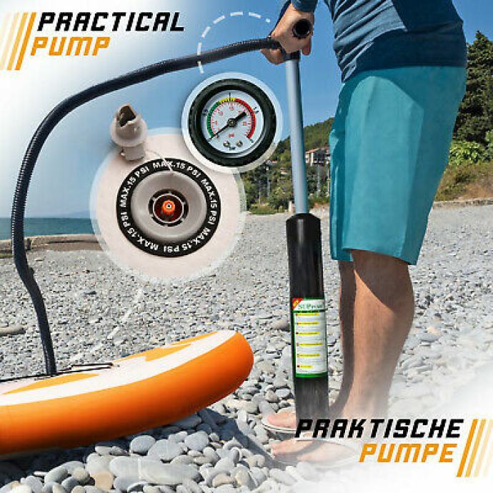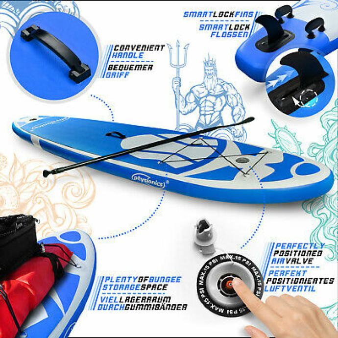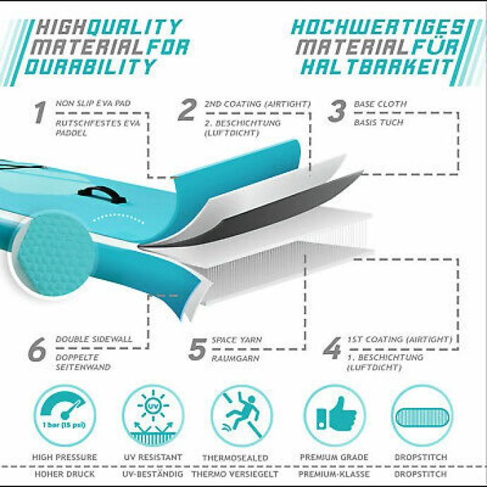 Ova SUP daska na napuhavanje 305 cm 320 cm i 360 cm izrađena je od PVC materijala, koji je ojačan tehnologijom padajućih šavova i obećava trajnost i elastičnost. Pogodno za djecu / adolescente (pod nadzorom odraslih) i odrasle⁷