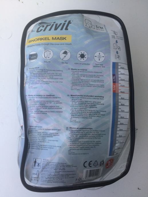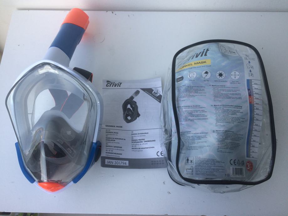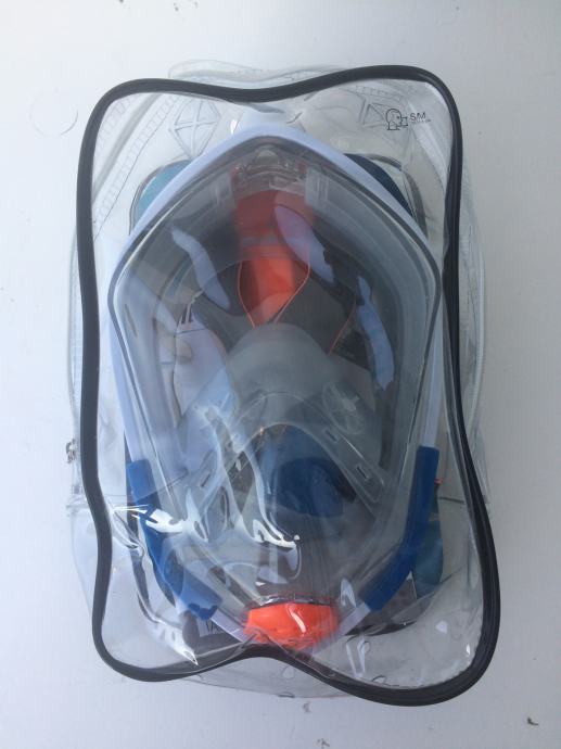Maska za ronjenje i snorkeling. Maska pokriva cijelo lice i disete na nos bez magljenja i to bez disalice, jer je disalica već ugrađena na vrhu maske. Kod urona mehanizam sa lopticom automatski zatvara disalicu, tako da vam ne moze uci voda. Integralna konstrukcija maske za prirodno disanje kroz nos i usta. Panoramsko vidno polje, efekt 180°, jednostavno oblačenje i skidanje. Podesivi remen od rastezljivog tekstila koji ne povlači kosu.