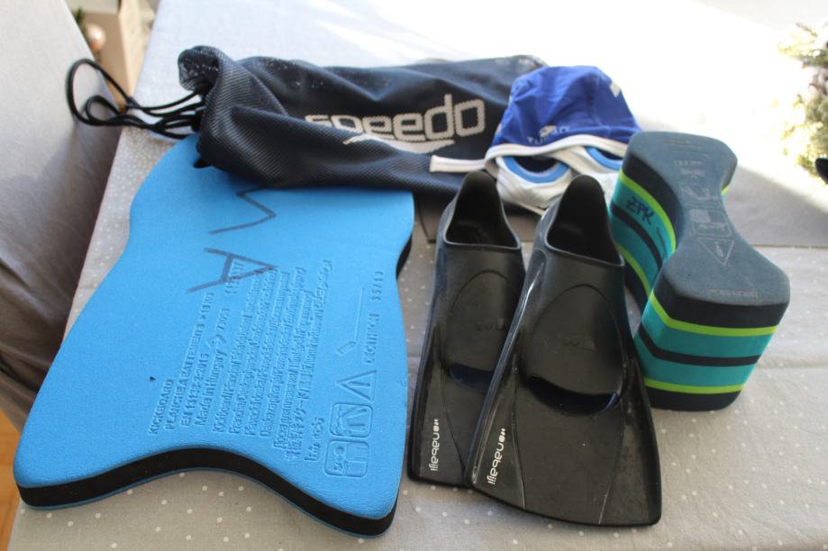 Oprema se sastoji od kapice, peraja, daske i vreća speedo.