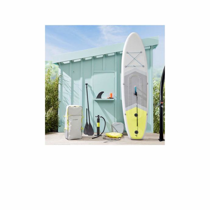 SUP (Stand Up Paddle Board) daska na napuhavanje nudi optimalnu zabavu u slobodno vrijeme za početnike ili napredne korisnike. Napuhati se može svega za par minuta i zabava već može početi. S 2-komornom konstrukcijom daska nudi povećanu sigurnost i stabilnost. Daska je dimenzije 305 x 76 x 15 cm, lako je prenosiva (teži samo 10kg) i ima maksimalnu nosivost od 115 kg. EVA baza daske osigurava optimalno prianjanje i štiti od proklizavanja. SUP dolazi u kompletu s praktičnom torbom za nošenje, zračnom pumpom s manometrom, sigurnosnim užetom na čičak, perajama, kompletom za popravak, a posebni dodatak je kajak naslon i obostrano veslo s kojim se može veslati u sjedećem položaju. Uključeno sigurnosno uže osigurava da daska uvijek ostane blizu, čak i ako padneš u vodu. Mala oštećenja ili ventili koji propuštaju mogu se brzo popraviti uz pomoć priloženog seta za popravak i detaljnim uputstvima.