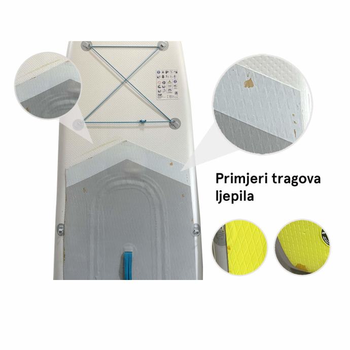 NAPOMENA: Ova verzija SUP daske ima vizualne nedostatke koji nikako ne utječu na ispravnost proizvoda. Vidljiv je mjehur na gornjem sloju i vidljivi su neki tragovi ljepila vidi slike). Možemo reči da se radi o robi s greškom iako je proizvod potpuno ispravan i spreman za korištenje, a to jamčimo garancijom od godinu dana. Pri testiranju proizvoda (dakle kratko je korišten), uočeni su tragovi ljepila i na površinskom sloju daske pojavio se mjehur koji se može (ali i ne mora) probušiti, ispuhati i sanirati ljepilom koje dolazi uz set za popravak. Ako te ne smeta, možeš ga i tako ostaviti jer to je samo površinski spužvasti sloj koji čuva od proklizavanja. Pojavio se zbog nedostatka ljepila na tom djelu. Mnogi se odlučuju na kupnju ovakvog proizvoda jer je cijena odlična, a nedostatak se može lako sanirati. Eto, ako te ne smetaju ti detalji, sitni tragovi korištenja, uštedi na kupnji i dobro se zabavi na vodi!
