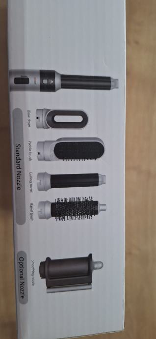 Uređaj dolazi s više nastavaka: standardnom mlaznicom, četkom za styling, četkom za kovrčanje, okruglom četkom te dodatnim nastavcima. Motor je visokih okretaja i stvara snažan protok zraka koji oblikuje kosu bez napetosti i lomljenja.