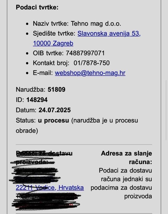 Prilažem i screenshot originalne narudžbe iz TehnoMag-a kao dokaz autentičnosti.