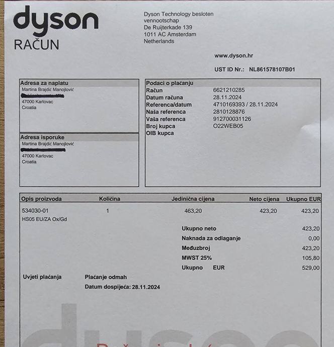 Kupljen u dyson webshopu u 11mj 2024, pod garancijom.