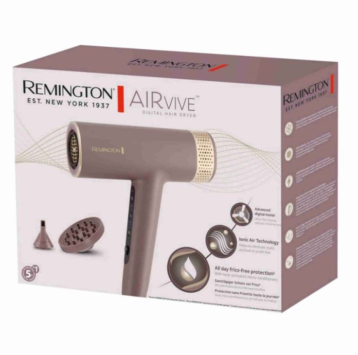 Postignite mekoću kose bez stršećih vlasi - koju ćete obožavati, uz digitalno sušilo za kosu REMINGTON® AIRvive™. Sušilo primjenjuje Ionic Air tehnologiju iznimne brzine koja eliminira statički elektricitet i brzo suši kosu bez ekstremne štetne topline, dok istovremeno na vašu kosu otpušta mikro regenerator koji se aktivira toplinom zraka kako biste imali cjelodnevnu zaštitu od stršećih vlasi¹. Napredni digitalni motor okreće se 5 x brže² kako bi stvorio veliku brzinu zraka i brzo posušio čak i najdužu i najgušću kosu. Osim što je ultra brzo, ovo sušilo je i ultra nježno. Zaštitni toplinski senzor regulira temperaturu zraka kako bi zaštitio kosu od iznimne topline, dok je postavka Comfort+™ nježna prema tjemenu i pomaže spriječiti nelagodno sakupljanje vrućeg zraka tijekom sušenja. Magnetski tanki koncentrator za sušenje kose i difuzor za definiranje kovrči se rotiraju za 360°, čime omogućavaju precizno oblikovanje kose, a 12 kombinacija topline i brzine puhanja zraka omogućuju oblikovanje svake vrste kose. Ovo sušilo ima dizajn u obliku slova "T", 15 % je manje³ i 30 % lakše³. Njegova akustika je optimizirana, a ekstra dugačak strujni kabel omogućuje lagano i ugodno rukovanje.