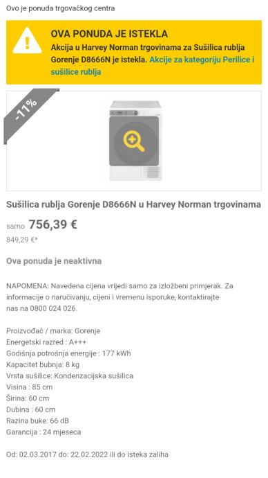 Detalji: Gorenje D8666N Advanced Line kondenzacijska sušilica spada u energetski razred A-60%. U bubanj zapremine 120 l možete staviti čak 8 kg rublja. Odlikuje ga LCD zaslon , sigurnost osigurava automatsko gašenje pri otvorenim vratima, programsko zaključavanje (zaštita od djece) i upozorenje za punu posudu kondenzata. Stroj ima ugrađen senzor vlage. Nudi tihi program s prilagođenim ritmom pranja koji smanjuje glasnoću rada perilice - idealno rješenje za noćno pranje.