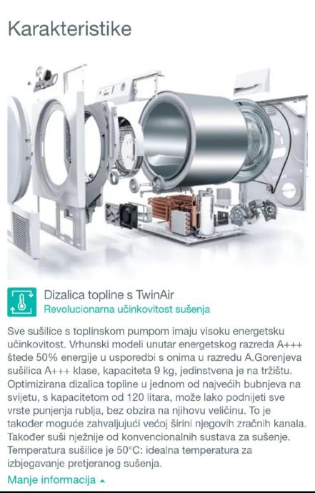 Odlikuje se jedinstvenim sustavom upuhivanja zraka u TwinAir bubanj koji omogućuje ravnomjerno intenzivan dotok toplog suhog zraka kroz oba zračna kanala tijekom dvosmjerne rotacije. Putanje zraka savršeno je prilagođeno smjeru vrtnje bubnja pa je rublje konstantno podvrgnuto konstantnom intenzitetu sušenja. Zbog ravnomjerne raspodjele rublje se ne petlja pa je završni učinak sušenja savršen.