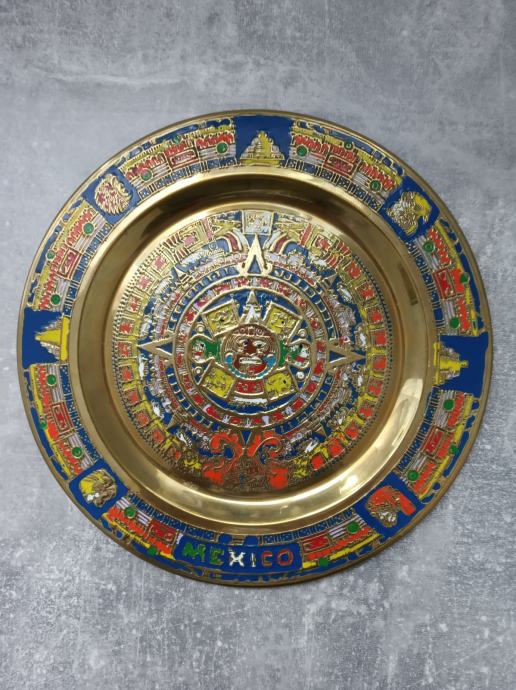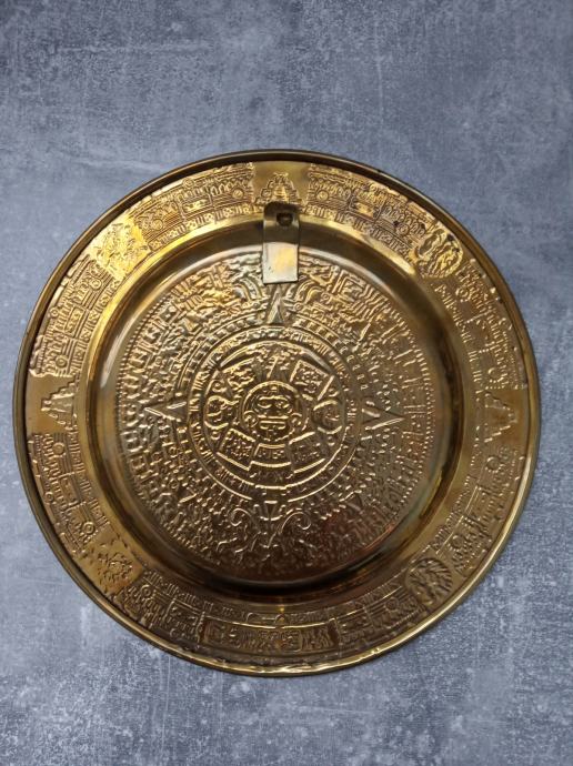 Metalni zidni tanjur-Astečki kalendar,promjer 20 cm,kupljen u Meksiku,nije korišten kao ukras