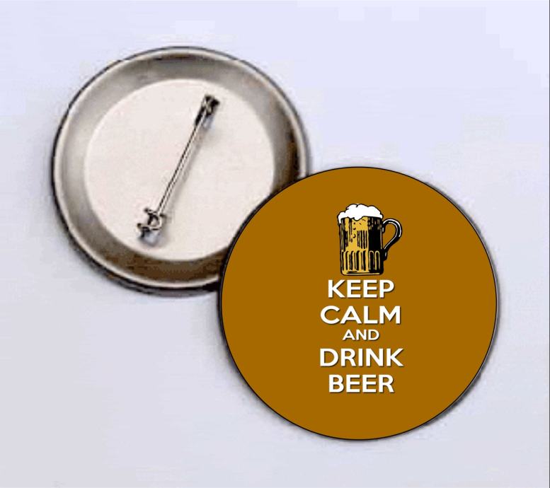 Bedž sa natpisom "KEEP CALM AND DRINK BEER" , metalni, promjer 44 mm.