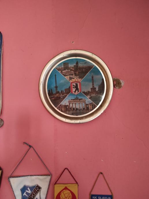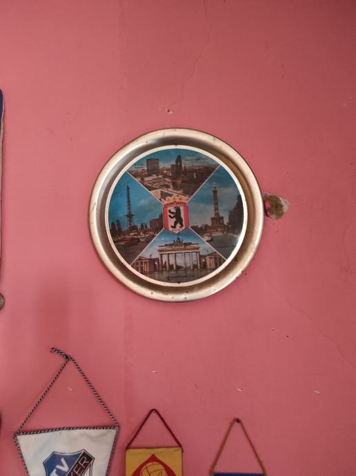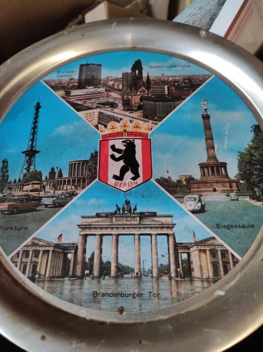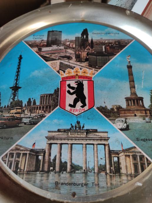 Aluminijski tanjur,Berlin Njemačka,star oko 60 godina,mislim da je iz 62 godine ili 52 nisam djeda dobro razumio? Mozete me dobiti na njuškalo ili viber a saljem postom ili tiskom ili u dogovoru sa kupcem, pogledaj slike.