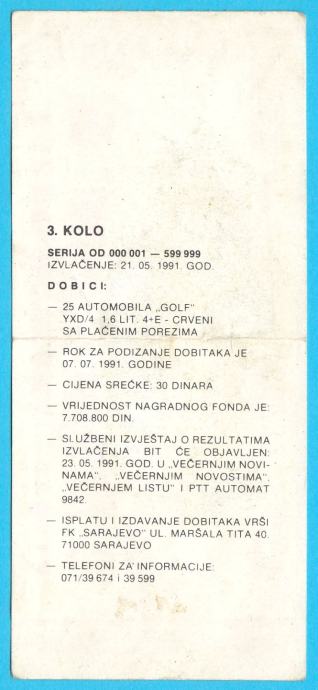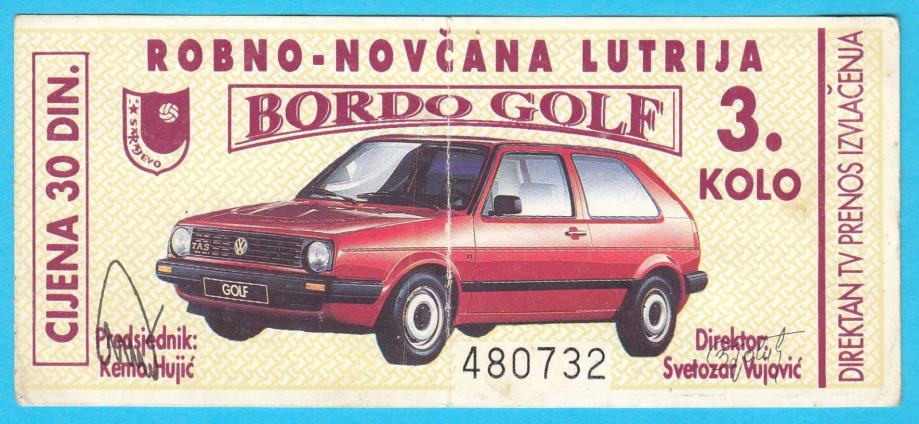 BORDO GOLF (FK Sarajevo) Bosnia i Hercegovina lutrija iz 1991. Nogomet