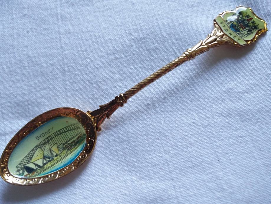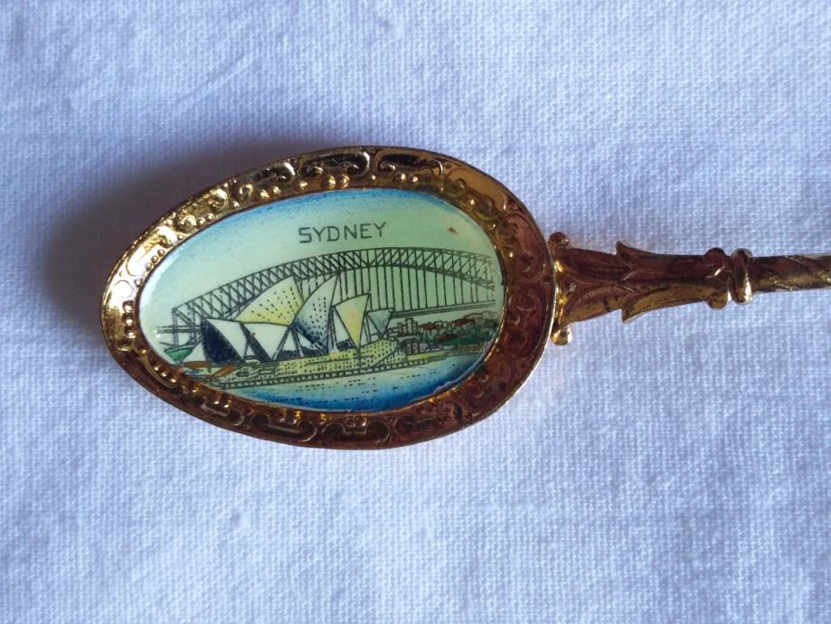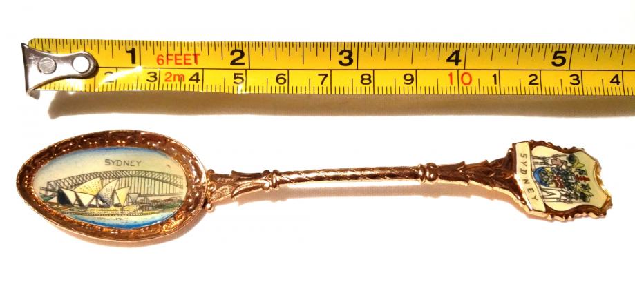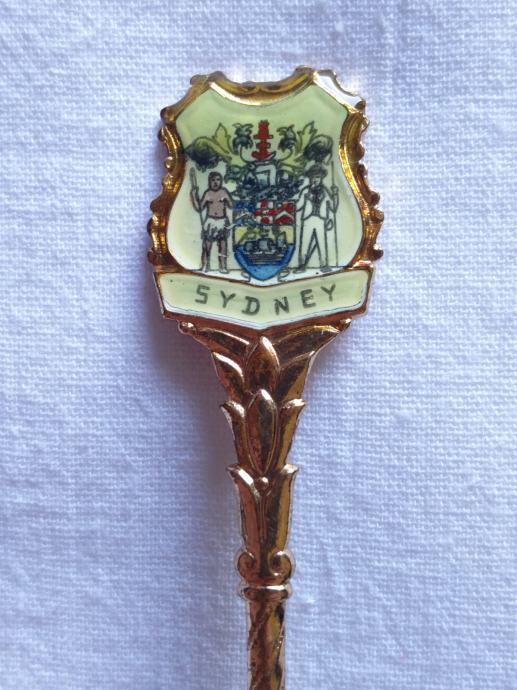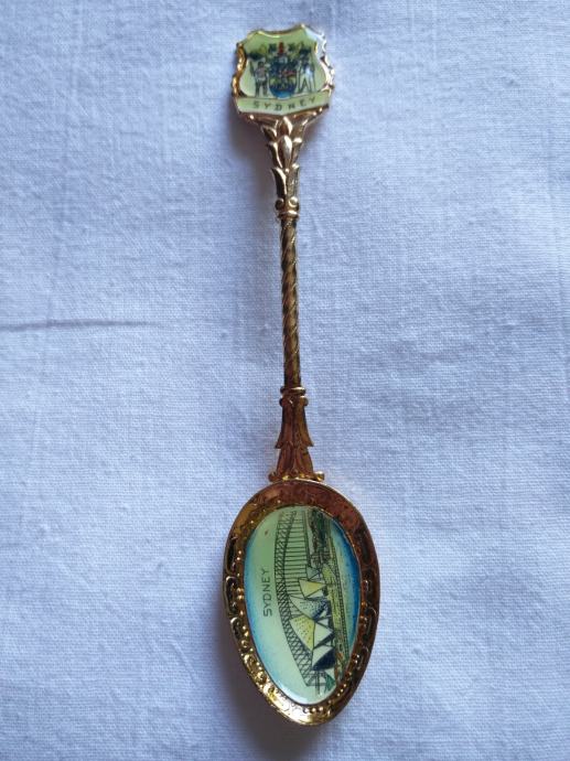 Čajna žlica: Australija - Sydney - Opera House - Coat of Arms. Godina nepoznata, metalna (pozlata?), sa grbom/ štitom na dršci i poznatom Sydneyskom lukom, mostom i operom. U prilično dobrom stanju, očuvana.