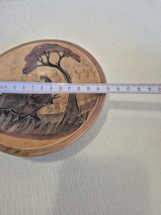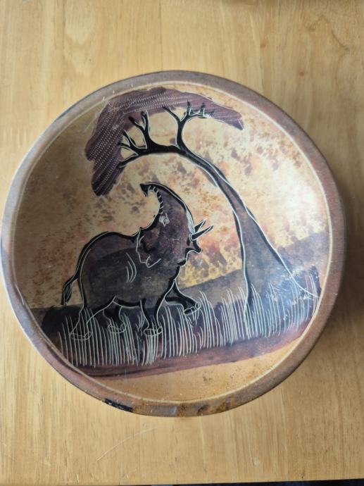 Prodajem dekorativnu zdjelu s afričkim motivom nosoroga i stabla u pejzažu savane, izrađenu od keramike/drva i ručno oslikanu toplim zemljanim tonovima. Površina ima poneke tragove korištenja i starosti, što joj daje rustikalni, vintage dojam, ali je i dalje vrlo efektna kao ukras na stolu, komodi ili polici. Zdjela je lagana, pogodna za odlaganje sitnica ili isključivo kao ukrasni predmet, a motiv nosoroga čini je zanimljivim komadom za ljubitelje afričke tematike