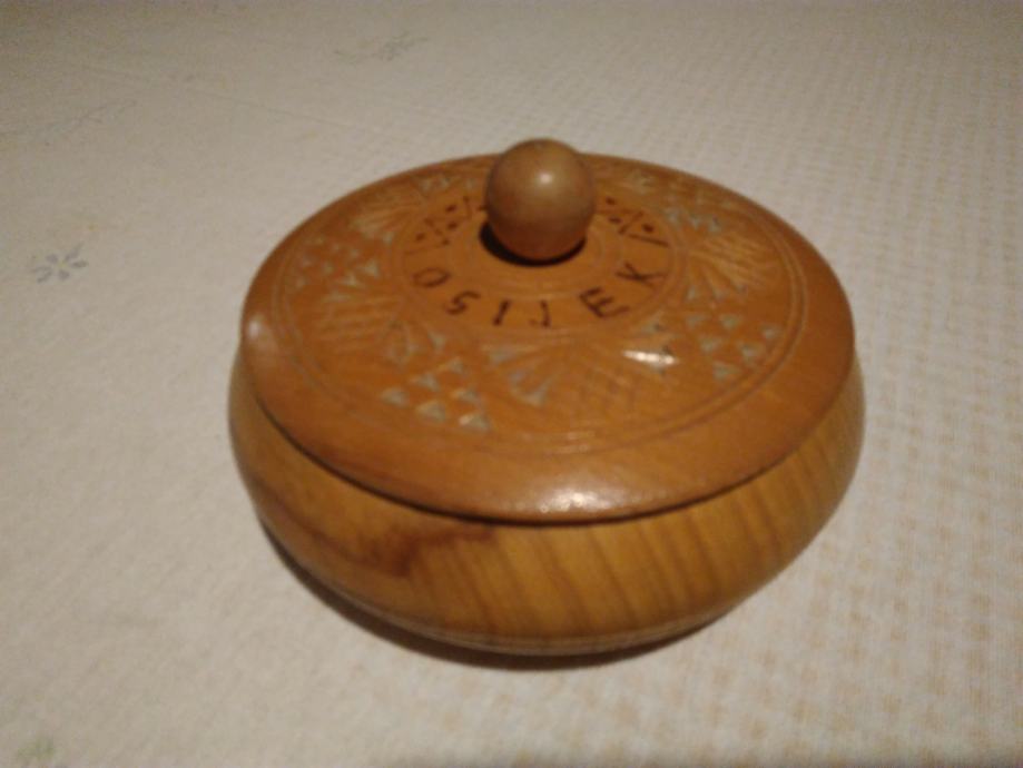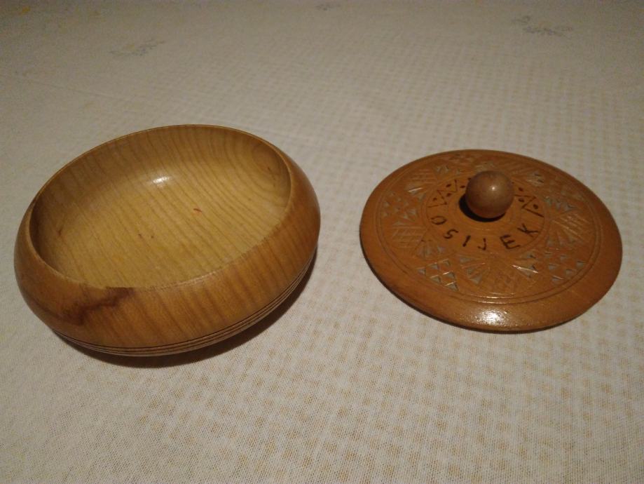 Prodajem drvenu zdjelu s poklopcem - suvenir rezbarija (ručni rad) star oko 50 godina.