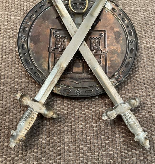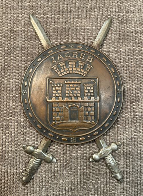 Limeni grb grada Zagreba sa mačevima. Visina sa mačevima 14 cm, promjer 8,3 cm. Sve vidljivo na slikama.091/6550922.