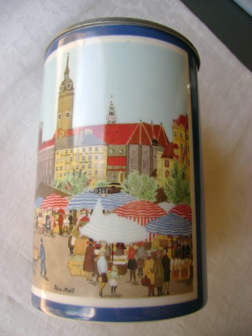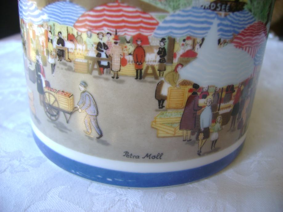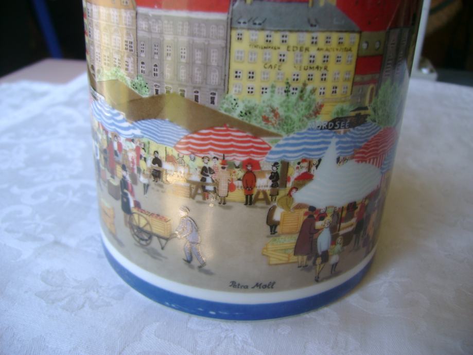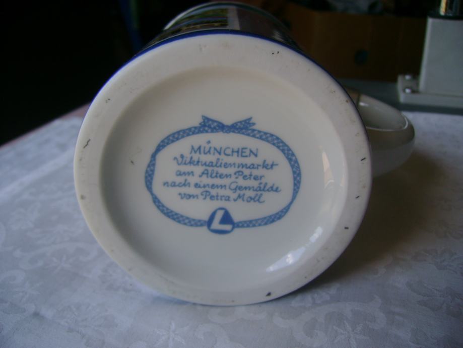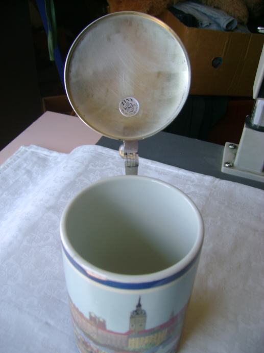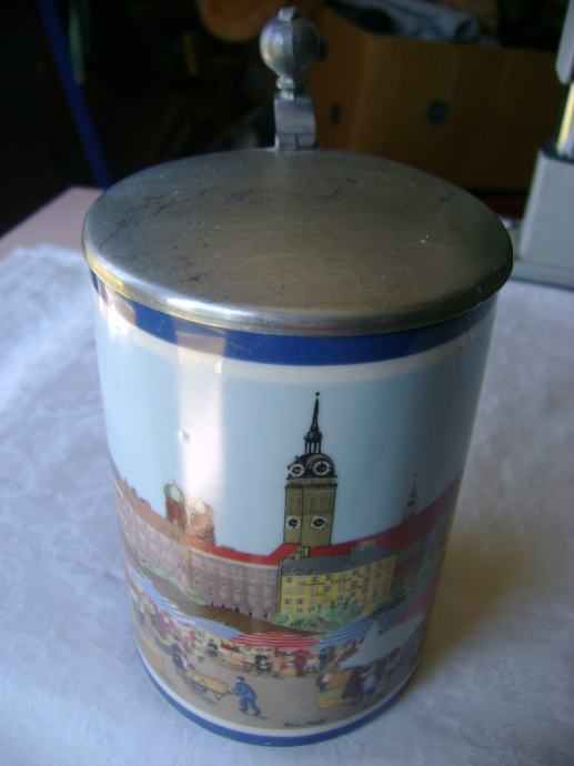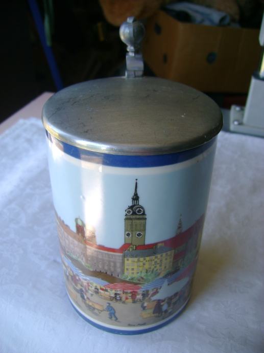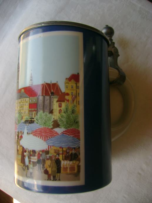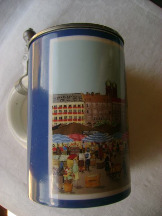 Kolekcionarska keramička krigla za pivo sa poklopcem od zina (promjer cca 9 cm, ukupna visina 17 cm) i motivom Viktualien Markt am Alten Peter, poznate slikarice Petre Moll.