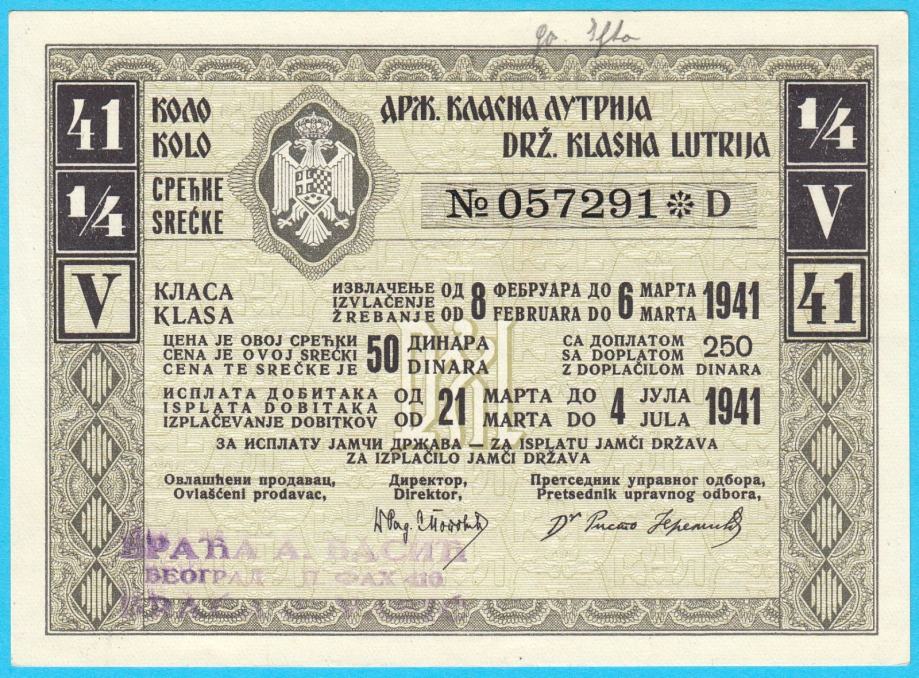 KRALJEVINA JUGOSLAVIJA - DRŽAVNA KLASNA LUTRIJA (1941. god.)